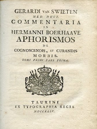 5 parti in 10 voll. in-8° (249x189mm), pp. (14) lr, (1); 536-956; (6), 411; 811; (10), 348; 349-684; (6), 392; 393-751; (1), VII, 371; (6), 396; leg. m. pelle coeva con tit. e fregi oro al dorso. Tagli a spruzzo azzurri. Fregi tipogr. ai frontespizi. Fregi tipogr. n.t. Amplissimo indice degli autori e delle materie in fine dell'ultimo volume. Edizione torinese del monumentale commento di gerard Van Swieten agli aforismi medici di Hermann Boerhaave ('Aphorismi de cognoscendis et de curandis morbis', Leyden, 1709), uscito a Leida tra il 1745 e il 1772 e tradotto nelle principali lingue europee. Esso costituisce il più significativo documento del nuovo ippocratismo che ebbe il suo centro principale a Vienna. Boerhave (Voorhout, 1668-Leida, 1782), medico e scienziato tra i principali del suo tempo, cercò di conciliare l'ippocratismo con i principi della iatrochimica e della iatromeccanica. Nella sua vastissima opera si occupò anche di chimica e di botanica. Gerard Van Swieten (Leida, 1700-Vienna, 1782), insigne medico olandese, fu tra i fondatori della Scuola di Medicina di Vienna. Allievo del Boerhaave in gioventù, fu tra l'altro medico di corte di Maria Teresa. Il suo nome resta legato anche al cosiddetto 'liquore di Van Swieden', che egli prescrisse per la cura della sifilide. Eccellenti esemplari con qualche alone e brunitura. Cfr. Fondo Olschki, V, 1081 (ed. del 1755 e del 1771-73). Graesse, VII, 257. Wellcome, II, p. 192.