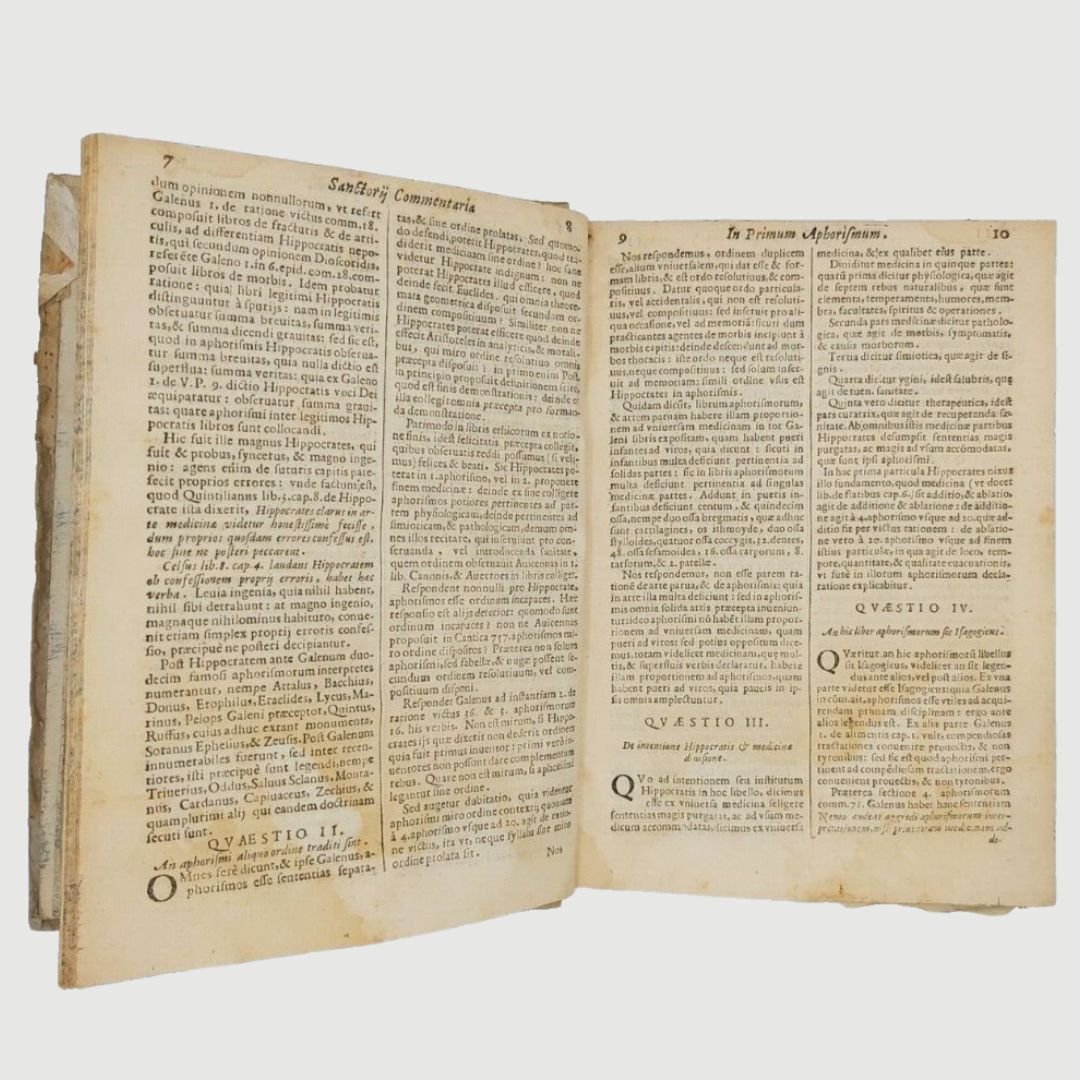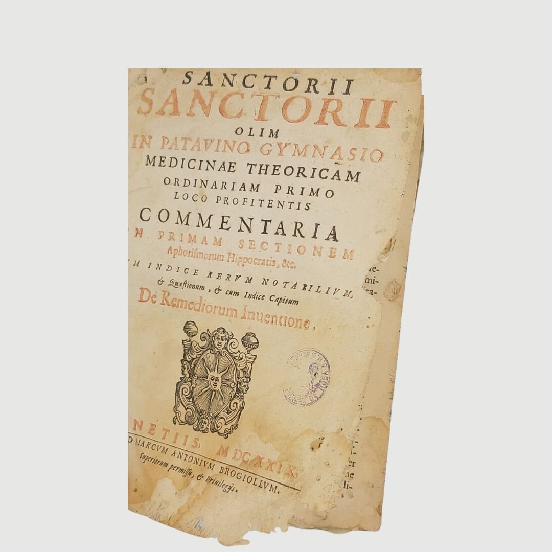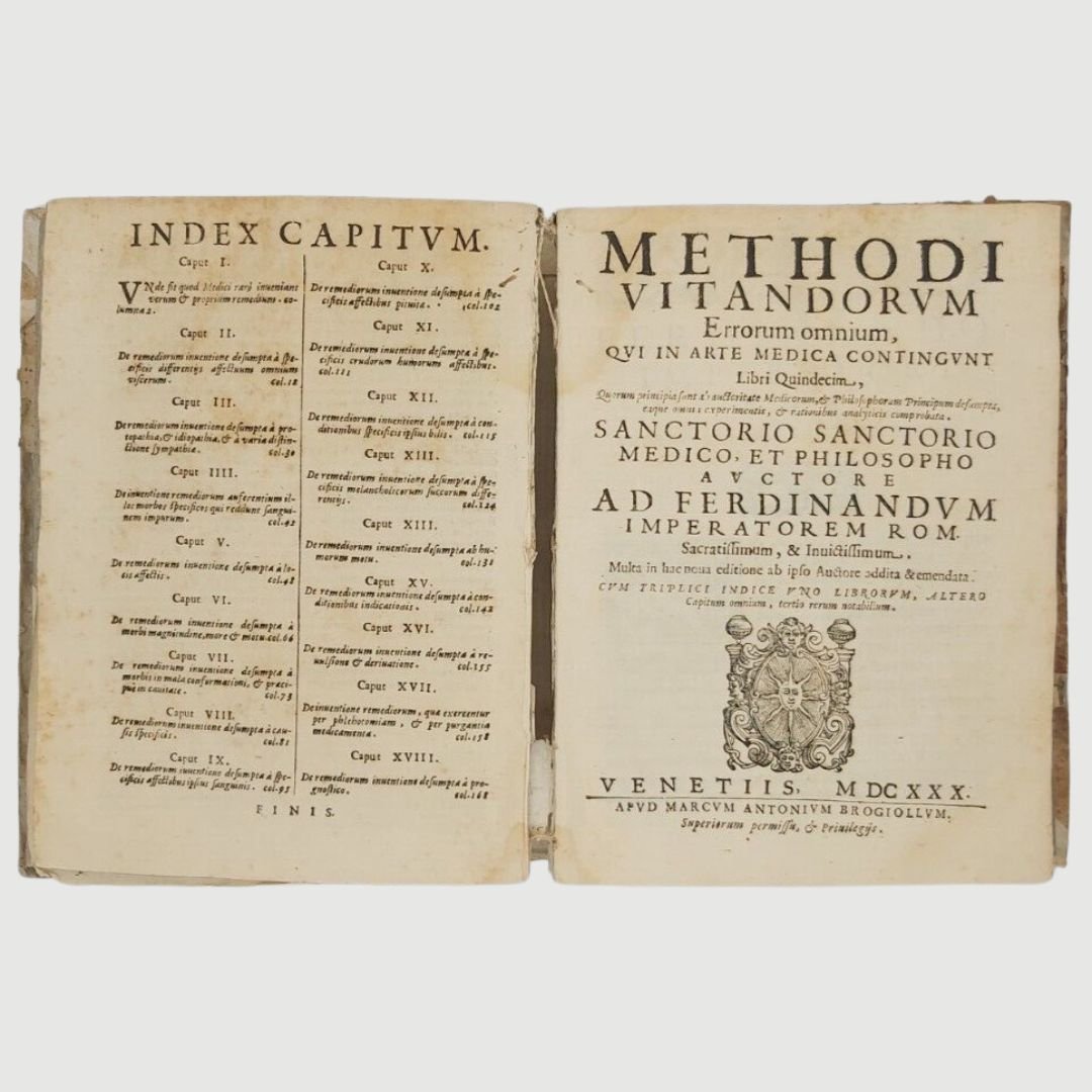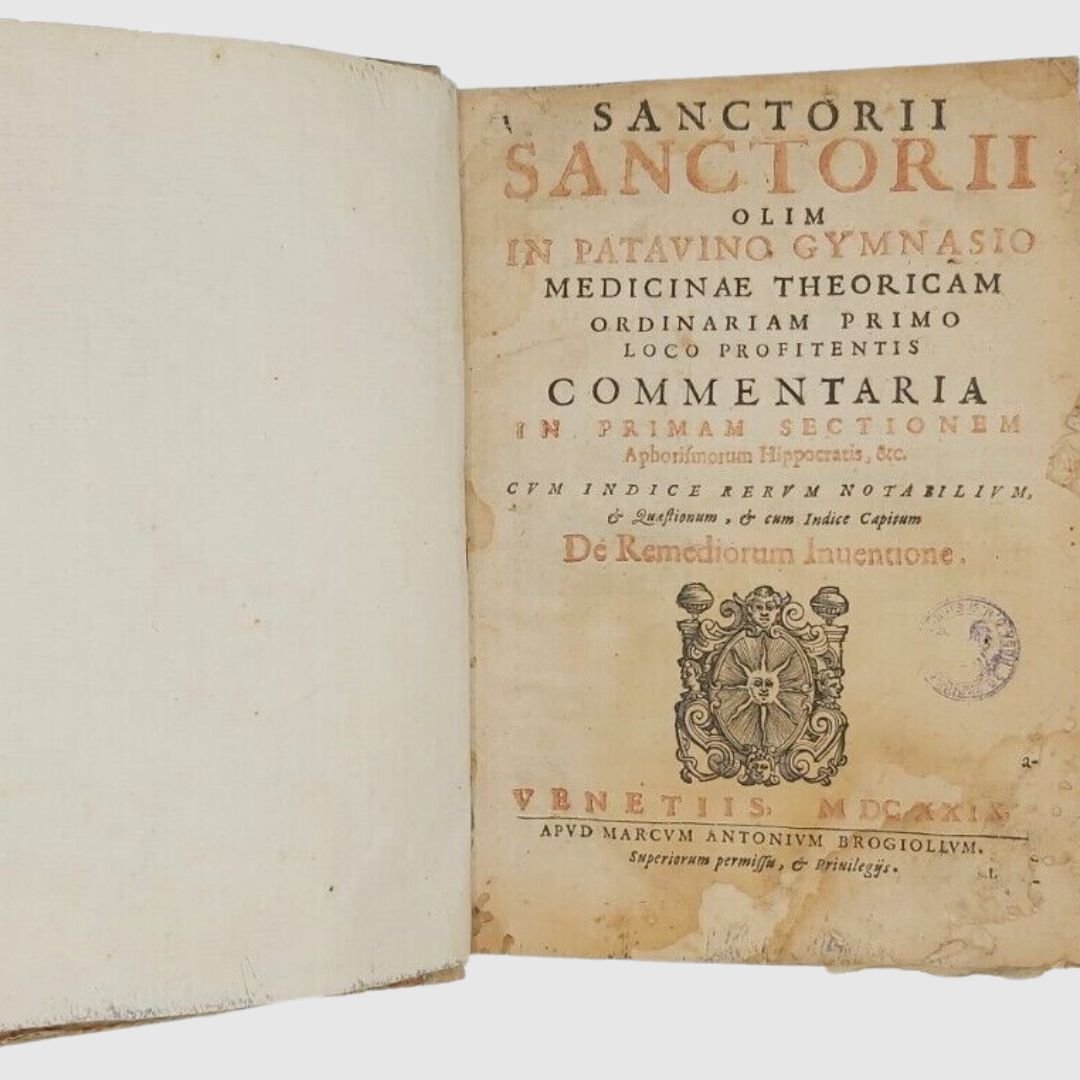 In-4 antico (cm 22). Opera in due parti. cc. 12, colonne 532, c. 1 [errata]; colonne 170. Legatura settecentesca in mezza pergamena. Mende alla carta dei piatti, costola allentata, gore di vecchia umidità; buchetti e piccole mancanze ai margini bianchi del primo frontespizio e alle prime carte; timbr. di biblioteca estinta al primo fontesp. Esemplare rifilato in testa. Rara edizione. Unito, dello stesso autore: Methodi Vitandorum. Errorum omnium, qui in arte medica contingunt. Libri quindecim. Venetiis, Brogiollum, 1630, cc. 32, colonne 968 su 972 [i.e. 976], errore di numerazione alle colonne 603-606. Esemplare mutilo della carta finale (4 colonne). La dottrina dell’ “uomo macchina” o “iatrofisica”, appoggiata da Cartesio, ebbe come caposcuola proprio il S., il quale mise il suo ingegno meccanico al servizio della medicina, progettando vari e ben congegnati strumenti: il primo termometro clinico, un trequarti con cannula per la tracheotomia e un orologio per misurare il polso. Tuttavia, l’invenzione più famosa del Sanctorio rimane la macchina per pesare, o bilancia, sulla quale passò letteralmente gran parte della sua vita. Sulla bilancia consumava i suoi pasti, e perfino dormiva. Valutava il peso della “traspirazione invisibile”, alla quale attribuiva enorme importanza. I risultati di queste sue indagini di pioniere nel campo del “metabolismo”, furono raccolti in una serie di “Aforismi”, pubblicati per la prima volta nel 1614. Durante il sonno la traspirazione insensibile è maggiore che non nelle ore di veglia e ammonta a circa quaranta once; La traspirazione insensibile è naturale ed è segno di salute, il contrario vale per il sudore. Questi aforismi contengono molti principi sensati e il libro è, fra i classici della medicina, uno dei più interessanti. Cfr. Guthrie, p. 189-190.