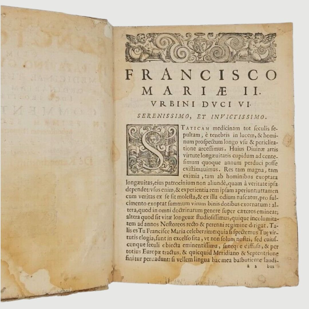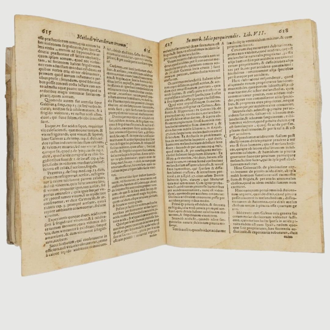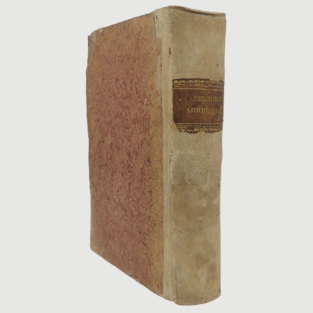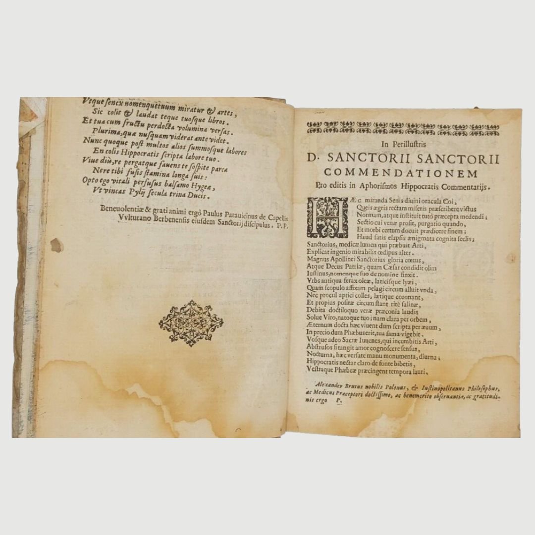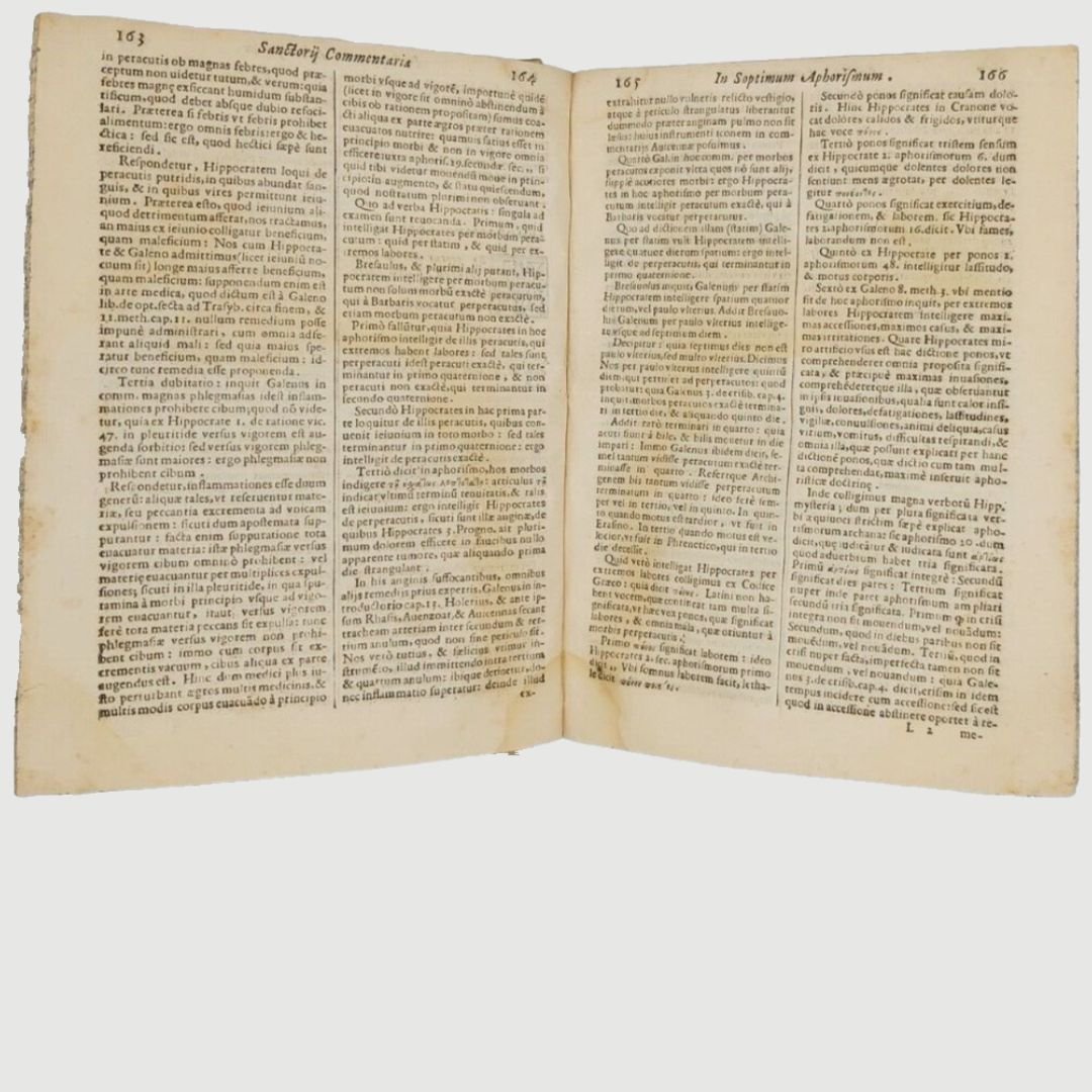 In-4 antico (cm 22). Opera in due parti. cc. 12, colonne 532, c. 1 [errata]; colonne 170. Legatura settecentesca in mezza pergamena. Mende alla carta dei piatti, costola allentata, gore di vecchia umidità; buchetti e piccole mancanze ai margini bianchi del primo frontespizio e alle prime carte; timbr. di biblioteca estinta al primo fontesp. Esemplare rifilato in testa. Rara edizione. Unito, dello stesso autore: Methodi Vitandorum. Errorum omnium, qui in arte medica contingunt. Libri quindecim. Venetiis, Brogiollum, 1630, cc. 32, colonne 968 su 972 [i.e. 976], errore di numerazione alle colonne 603-606. Esemplare mutilo della carta finale (4 colonne). La dottrina dell’ “uomo macchina” o “iatrofisica”, appoggiata da Cartesio, ebbe come caposcuola proprio il S., il quale mise il suo ingegno meccanico al servizio della medicina, progettando vari e ben congegnati strumenti: il primo termometro clinico, un trequarti con cannula per la tracheotomia e un orologio per misurare il polso. Tuttavia, l’invenzione più famosa del Sanctorio rimane la macchina per pesare, o bilancia, sulla quale passò letteralmente gran parte della sua vita. Sulla bilancia consumava i suoi pasti, e perfino dormiva. Valutava il peso della “traspirazione invisibile”, alla quale attribuiva enorme importanza. I risultati di queste sue indagini di pioniere nel campo del “metabolismo”, furono raccolti in una serie di “Aforismi”, pubblicati per la prima volta nel 1614. Durante il sonno la traspirazione insensibile è maggiore che non nelle ore di veglia e ammonta a circa quaranta once; La traspirazione insensibile è naturale ed è segno di salute, il contrario vale per il sudore. Questi aforismi contengono molti principi sensati e il libro è, fra i classici della medicina, uno dei più interessanti. Cfr. Guthrie, p. 189-190.