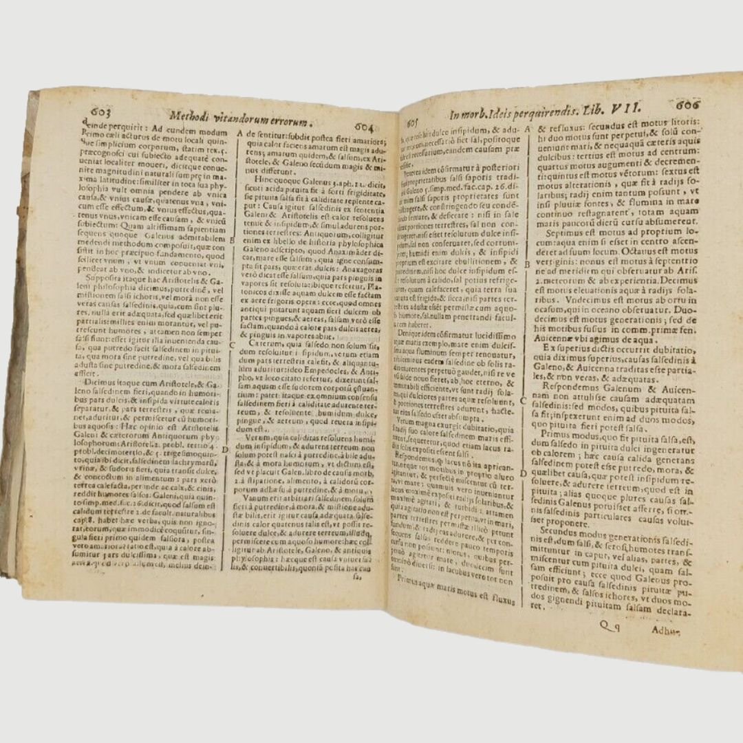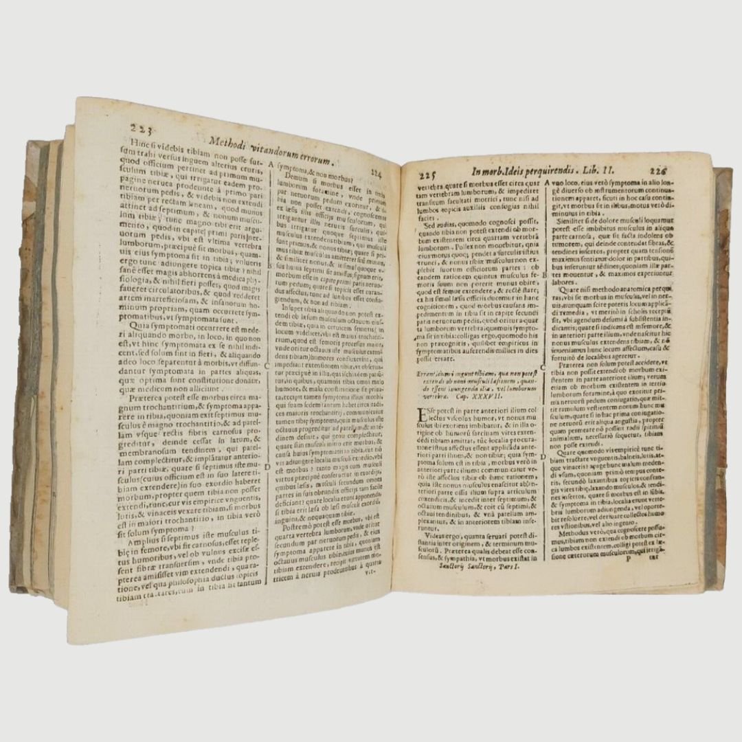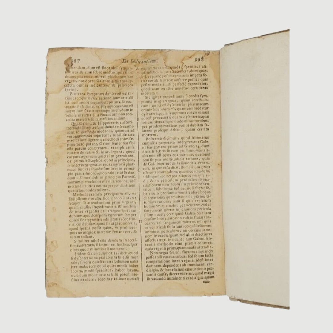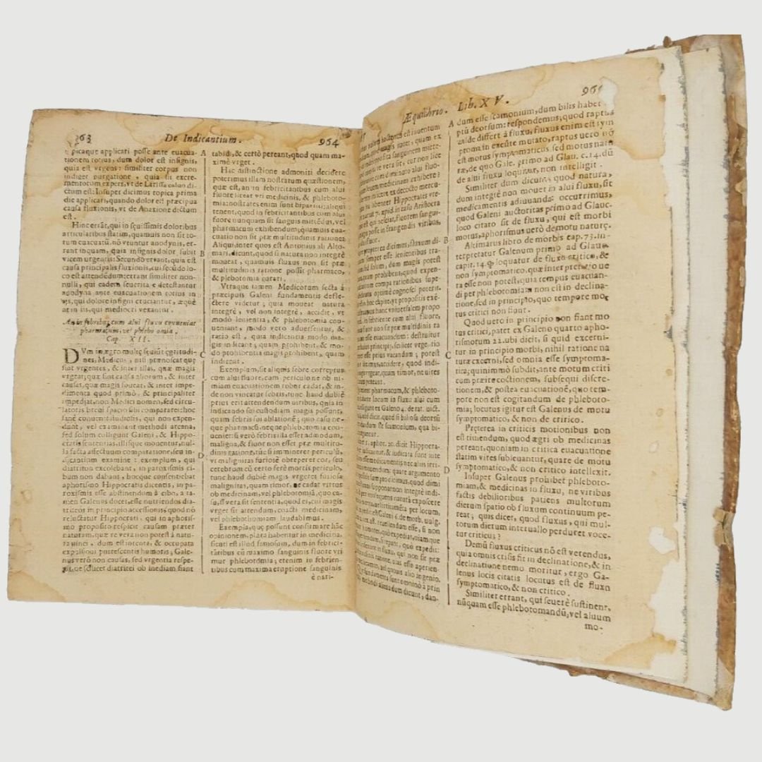 In-4 antico (cm 22). Opera in due parti. cc. 12, colonne 532, c. 1 [errata]; colonne 170. Legatura settecentesca in mezza pergamena. Mende alla carta dei piatti, costola allentata, gore di vecchia umidità; buchetti e piccole mancanze ai margini bianchi del primo frontespizio e alle prime carte; timbr. di biblioteca estinta al primo fontesp. Esemplare rifilato in testa. Rara edizione. Unito, dello stesso autore: Methodi Vitandorum. Errorum omnium, qui in arte medica contingunt. Libri quindecim. Venetiis, Brogiollum, 1630, cc. 32, colonne 968 su 972 [i.e. 976], errore di numerazione alle colonne 603-606. Esemplare mutilo della carta finale (4 colonne). La dottrina dell’ “uomo macchina” o “iatrofisica”, appoggiata da Cartesio, ebbe come caposcuola proprio il S., il quale mise il suo ingegno meccanico al servizio della medicina, progettando vari e ben congegnati strumenti: il primo termometro clinico, un trequarti con cannula per la tracheotomia e un orologio per misurare il polso. Tuttavia, l’invenzione più famosa del Sanctorio rimane la macchina per pesare, o bilancia, sulla quale passò letteralmente gran parte della sua vita. Sulla bilancia consumava i suoi pasti, e perfino dormiva. Valutava il peso della “traspirazione invisibile”, alla quale attribuiva enorme importanza. I risultati di queste sue indagini di pioniere nel campo del “metabolismo”, furono raccolti in una serie di “Aforismi”, pubblicati per la prima volta nel 1614. Durante il sonno la traspirazione insensibile è maggiore che non nelle ore di veglia e ammonta a circa quaranta once; La traspirazione insensibile è naturale ed è segno di salute, il contrario vale per il sudore. Questi aforismi contengono molti principi sensati e il libro è, fra i classici della medicina, uno dei più interessanti. Cfr. Guthrie, p. 189-190.