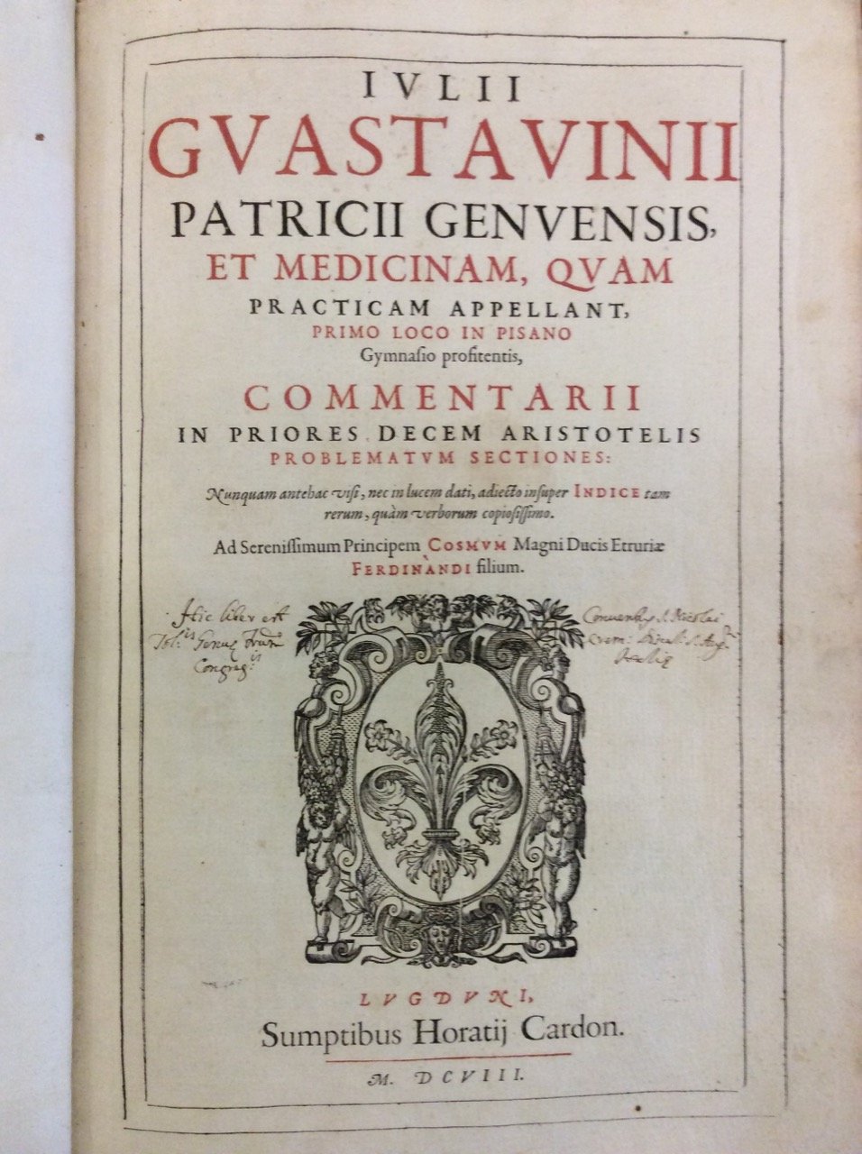 In-4 gr. (mm. 356x225), p. pergamena antica, dorso a cordoni (con mancanze) e titolo ms., pp. (8),395,(13, di Indice), testo entro doppio filetto, frontespizio con titolo in rosso e nero e marca tipografica xilografata, ornato da belle testatine, grandi capilettera e finali, pure inc. su legno. Dedicato a Serenissimum Principem Cosmum Magno Ducis Etruriae Ferdinandi filium.L'opera contiene i commenti di Giulio Guastavino ai primi dieci libri dei Problemata di Aristotele riguardanti la medicina, scritti in greco, con la versione latina di Theodoro Gaza."Prima ed unica edizione".Cfr. Krivatsy, n. 5065, p. 504 - Dictionaire de sciences médicales,IV, p. 534. Aristotele, per quanto abbia certamente esercitato una scarsa influenza sui medici dei suoi tempi, pure per l'importanza che il maestro di color che sanno' ebbe in tutta la storia della coltura umana fino al XVI secolo e oltre, è da considerrsi anche nel campo della medicina come uno dei maggiori precursori, così Castiglioni Storia della medicina, p. 186.Eloy Dizionario storico della medicina,III, p. 207: Giulio Guastavino nacque in Genova da una famiglia patrizia. Fu primario Professore nella Scuola di Medicina di Pisa ca. l'anno 1614 (morì nel 1633).Con arrossature interc. nel testo, talvolta su tutta la pagina, per la qualità della carta; lieve alone all'angolo super., ma complessivam. buon esemplare.