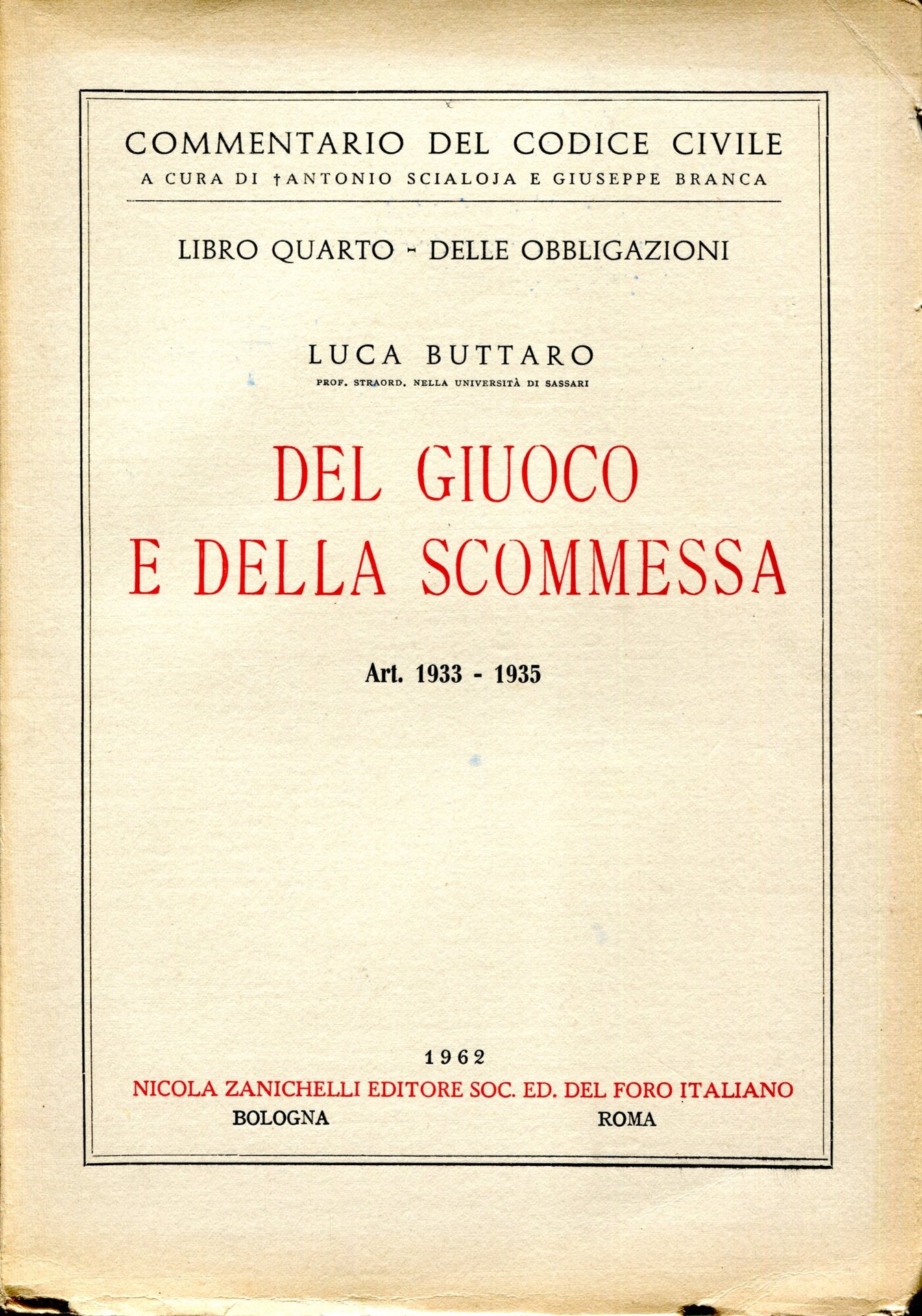 Commentario del codice civile. A cura di Scialoja e Branca. Libro quarto-Delle obbligazioni. Del gioco e della scommessa. Art.1933-35
