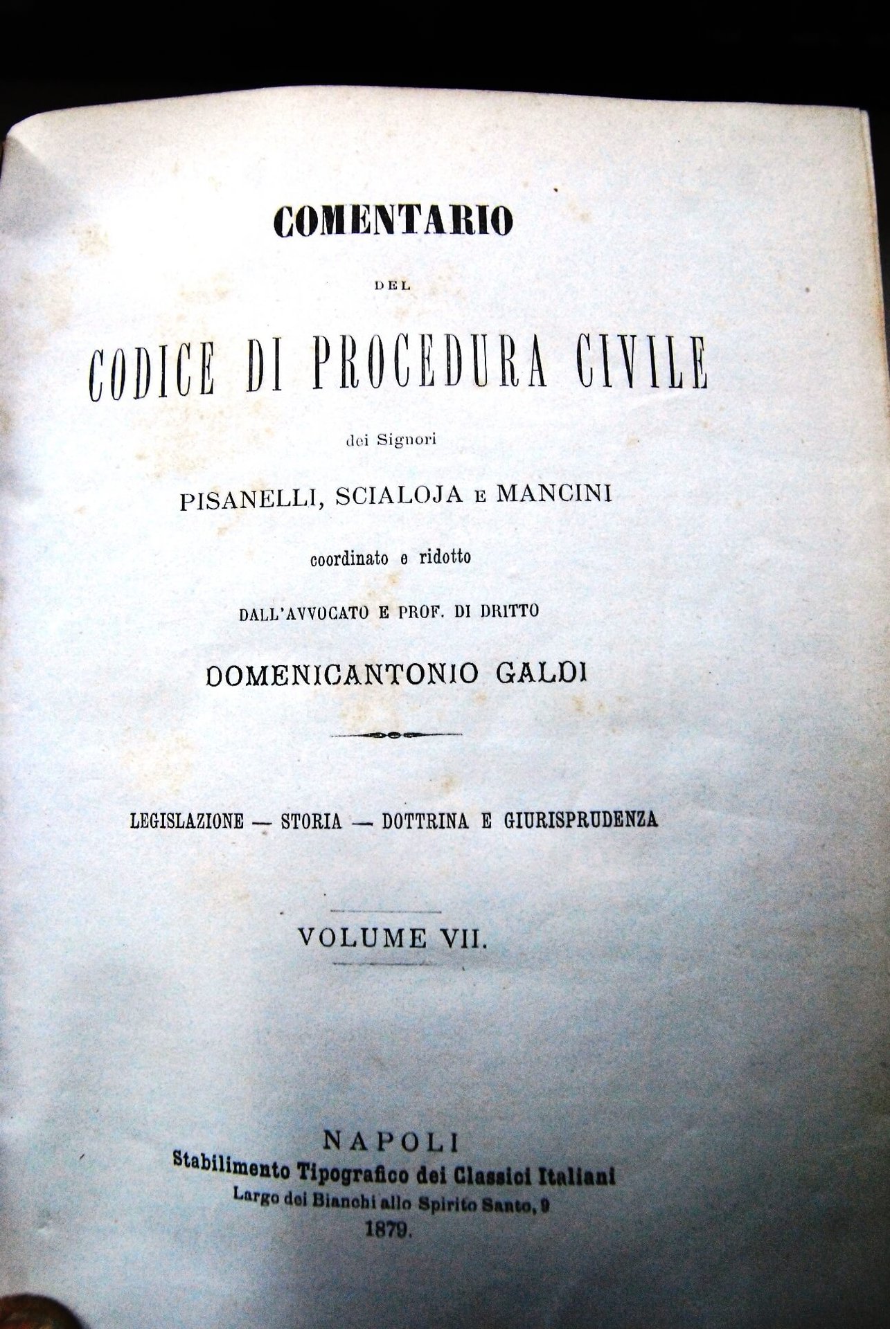 Domenicantonio galdi Commentario del codice di procedura civile dei signori pisanelli scajola mancini ? volume VII. Napoli 1879 Ottime Rigida .