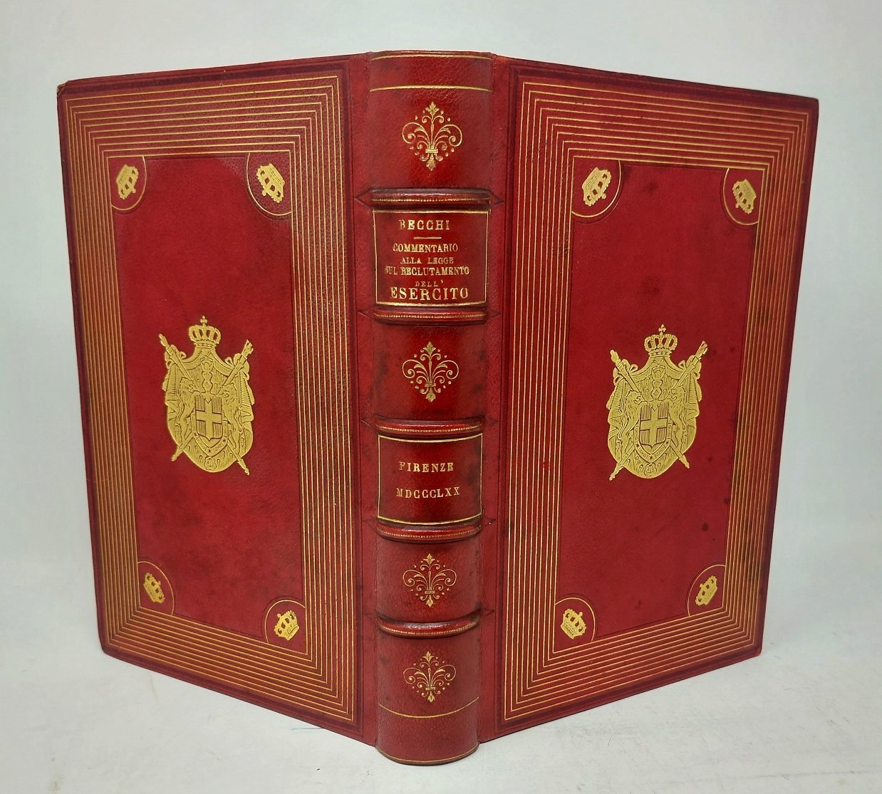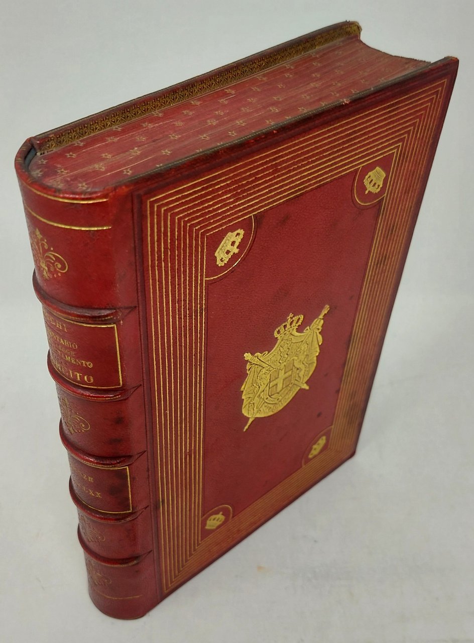 >in-8 (230x150 mm), pp. (6), 401, bella legatura del XIX secolo in marocchino rosso alle armi dei Savoia incorniciate da 10 ordini di filetti dorati, quattro corone negli angoli interni, titolo e fregi oro al dorso a cinque nervi, tagli rossi con stelline dorate, dentelles interne. Commentario compilato da Becchi, all'epoca Capo Sezione nel Ministero della guerra. Ex libris "Biblioteca di Sar il Duca d'Aosta". Bellissimo esemplare.
