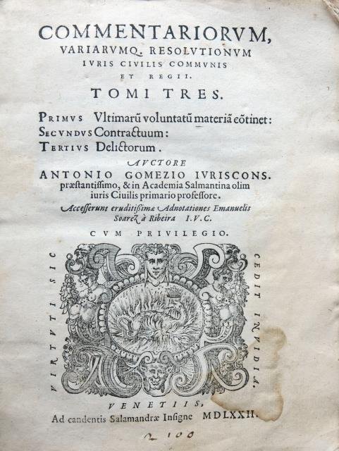Commentariorum, variarumq. resolutionum iuris civilis communis et regii. Tomi tres. Primus vltimarum voluntatum materiam continet. Secundus contractuum. Tertius delictorum. Auctore Antonio Gomezio Iuriscons. Praestantissimo, & in Academia Salmantina olim iuris civilis primario professore. Accesserunt eruditissimae adnotationes Emanuelis Soarez à Ribeira I.V.C.