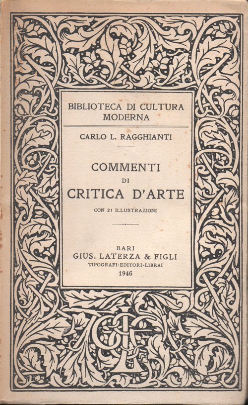 In-8° (20,2 x 12,4 cm), pp. XII, 352, (2), copertina editoriale. Qualche traccia d'uso e del tempo alla copertina, in particolare: pochi, piccoli, lievi segni d'umido; leggera brunitura al dorso e ai margini interno e superiore, per probabile esposizione alla luce; piccolo timbro circolare nel bordo superiore della quarta di copertina. Con 12 tavole, su carta lucida, ospitanti 21 illustrazioni in bianco e nero. Ad alcune pagine, in particolare nel margine superiore, qualche piccolo, lieve segno d'umido. Normale patina del tempo alle pagine, per il resto, ben conservato. Volume numero 398 nella "Biblioteca di Cultura Moderna". Indice: Avvertimento. Secondo avvertimento. Serie prima Profezia dell'Architettura (Critica sociologica e critica cattolica). L'arte e la realtà (accademie inutili). Critica d'arte e storia della critica. «Moderna estetica» supposta. L'arte e il macchinismo. Premesse alla critica dell'arte contemporanea. Storia di un problema critico (Per Antonio Pollaiolo). «Rinascimento», «Naturalismo» ed altri equivoci concetti. L'inconscio e l'arte. Serie seconda Sul metodo nello studio dei disegni. Medioevo accademico. Illimitata giovinezza. Documento sulla critica ermetica. L'architettura «in funzione» e F. Algarotti. Saggio di analisi linguistica dell'architettura moderna. Nota sull'urbanistica. Architetture scolastiche e loro significato. Indice dei nomi. Illustrazioni.