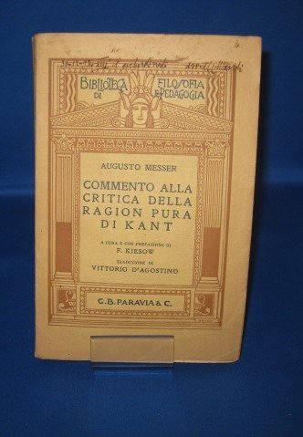 In-8° (19.5x13 cm) brossura editoriale con titoli in blu al dorso e al piatto anteriore entro bella cornice architettonica decó di Brugo. Pp VIII, 243, (1), all'antiporta ritratto del genio di Koninsberg. Collana Biblioteca di filosofia e pedagogia. Note e firme di appartenenza coeve alla testa del piatto anteriore e al frontespizio. Rare sottolineature a lapis colorati ma interno molto fresco. Più che buon esemplare. Prima edizione italiana (che segue l'originale tedesca del 1922) di questo fondamentale lavoro critico ermeneutico del capolavoro Kantiano elaborato dal filosofo e pedagogista di ambito psicologista August Messer e introdotto da Federico Kiesov psicologo Wundtiano trasferitosi a Torino per collaborare con Angelo Mosso.