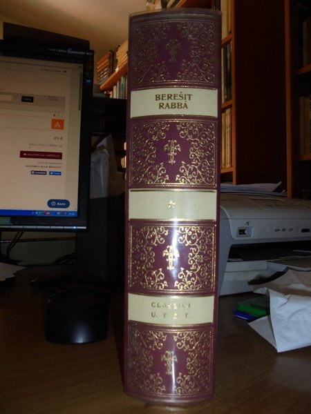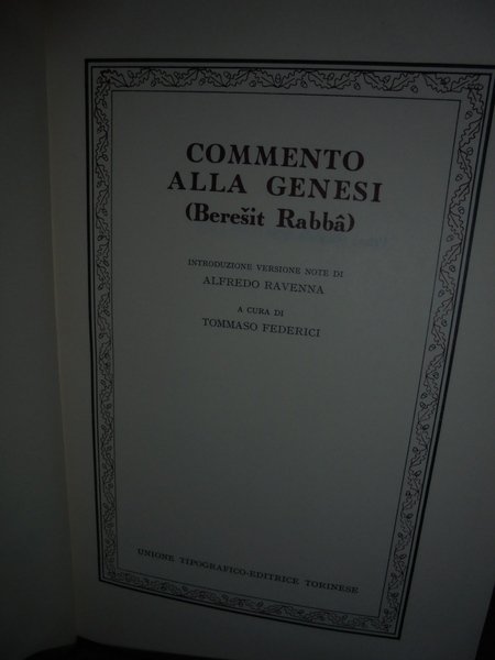 Commento alla Genesi (Beresit RABBA). Introduzione, versione, note di Alfredo Ravenna. A cura di Tommaso Federici. Prima edizione. In-8°, tela con fregi e titolo in oro al dorso, sovracopertina in acetato. 929 pp. con 9 tavole fuori testo. Esemplare come nuovo. Uff. TV. UTET