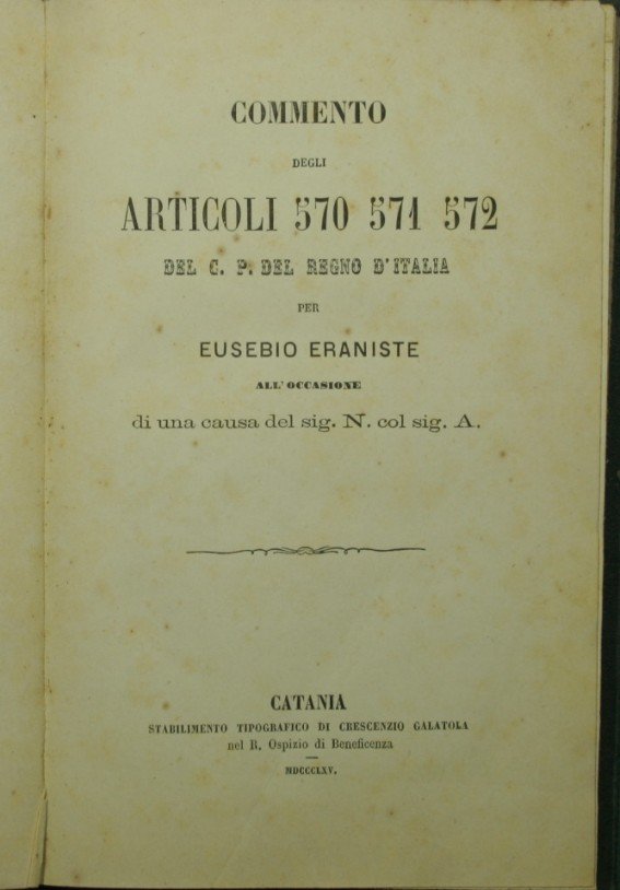 All'occasione di una causa del sig. N. col sig. A. - in 8° - pp.171 - Tela con titolo e fregi in oro al dorso - Tagli decorati - Titolo all'occhiello: Monocanoni intorno al vero reato di diffamazione e libello famoso