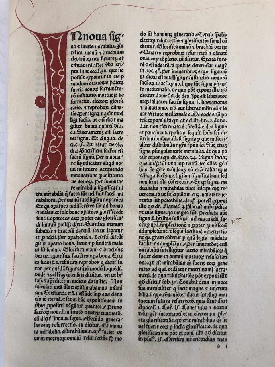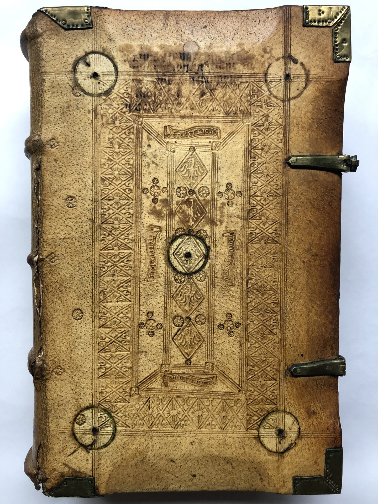 In-folio (300 x 200mm). 320 carte, grande iniziale in rosso di 26 linee, interamente rubricato. Legatura in pelle di scrofa coeva tedesca su assi di legno (Heilbronn), anticamente legato al pluteo, angoli e fermagli in metallo, borchie mancanti.