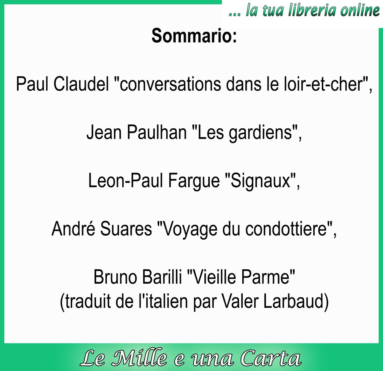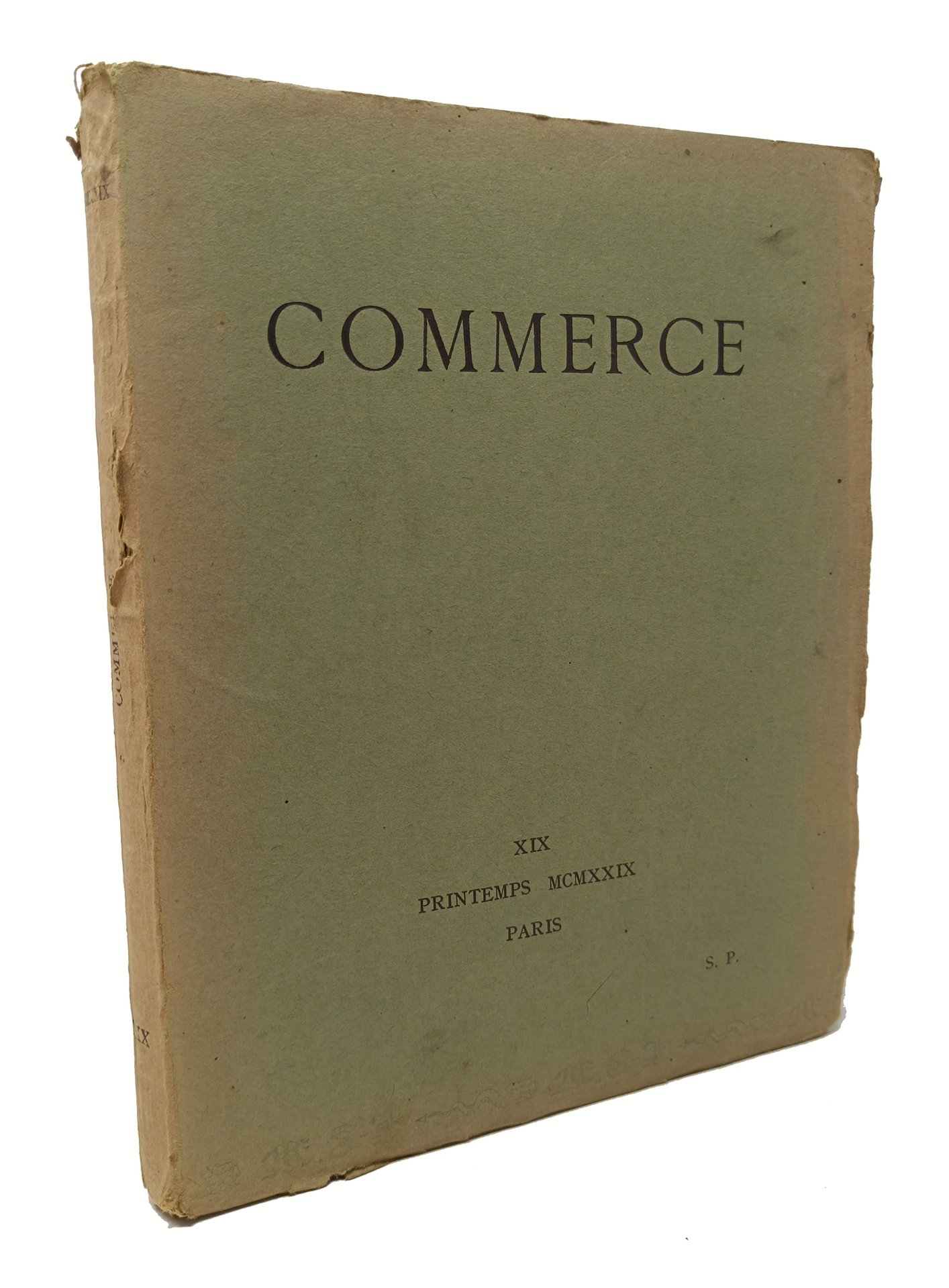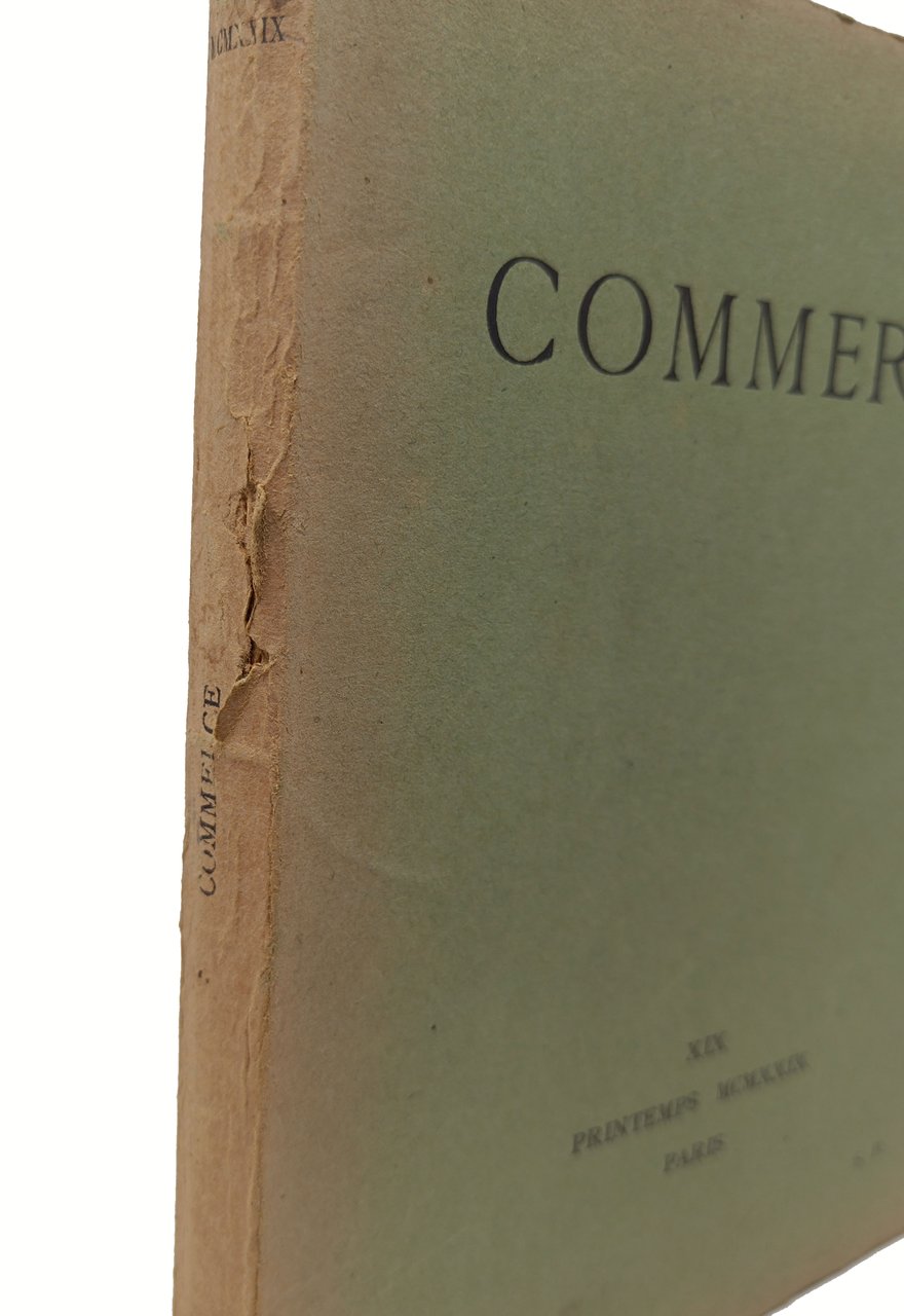 'COMMERCE / Cahiers trimestriels publiés par les soins de Paul Valer, Leon-Paul Fargue, Valer Larbaud' cahier XIX printemps 1929. Redaction et administration chez L. Giraud-Badin, Paris. Lingua del testo: francese. Formato: 19 x 24 cm circa. Pagine: 230 + [2]. Stato di conservazione: rotture sul dorso (insignificanti per quel che riguarda la legatura), piccole e marginali macchioline gialle ma, nel complesso, un buon esemplare. Brossura. Particolarmente interessante per il collezionista italiano in quanto in questo numero sono presenti due ampi saggi ce riguardano l'Italia (in particolare la Liguria e Parma). Sommaire: Paul Claudel 'conversations dans le loir-et-cher',Jean Paulhan 'Les gardiens', Leon-Paul Fargue 'Signaux', André Suares 'Voage du condottiere', Bruno Barilli 'Vieille Parme' (traduit de l'italien par Valer Larbaud'. Prestigiosa rivista letteraria, pubblicata in tiratura limitata, sulla quale scrissero alcuni tra i più importanti autori del periodo tra le due guerre. Su carta pregiata. Sulla copertina anteriore è stampata l'indicazione 'S. P.' che presumibilmente individua il tipo di carta pregiata utilizzata per stampare questo esemplare (anche se sulla pagina in cui è presente la giustificazione della tiratura non è indicato il numero di esemplare).