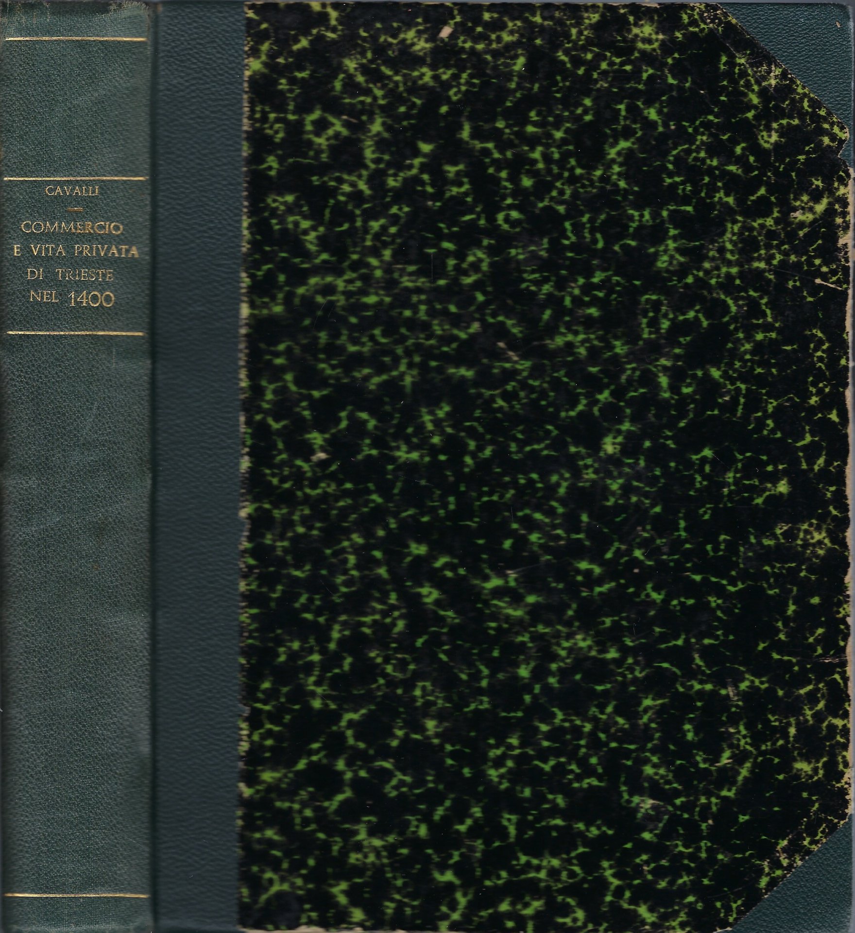 Rilegatura artigianale in mezzo zigrinato verde con angoli, e piatti rivestiti in carta marmorizzata con titoli in oro al dorso.