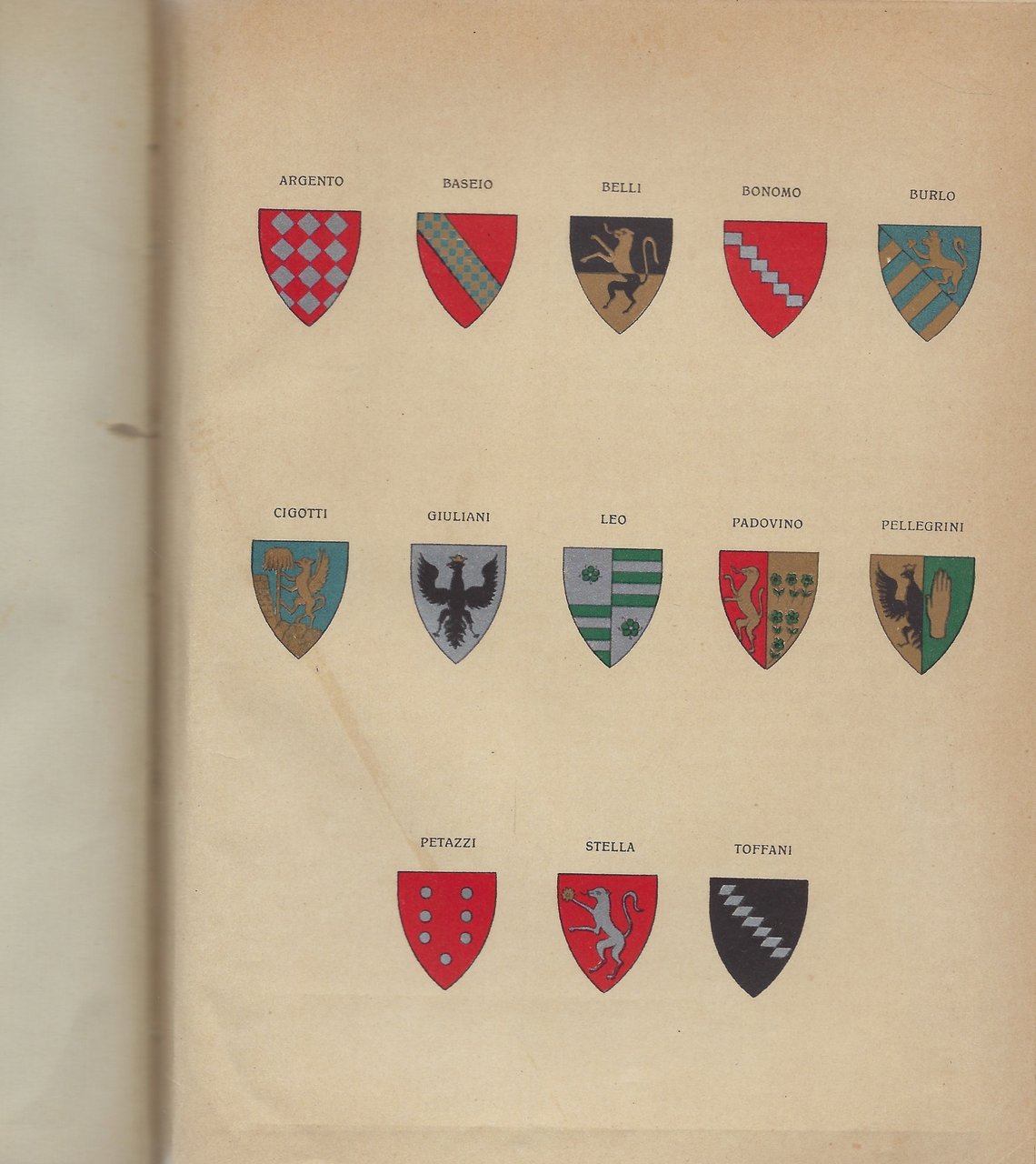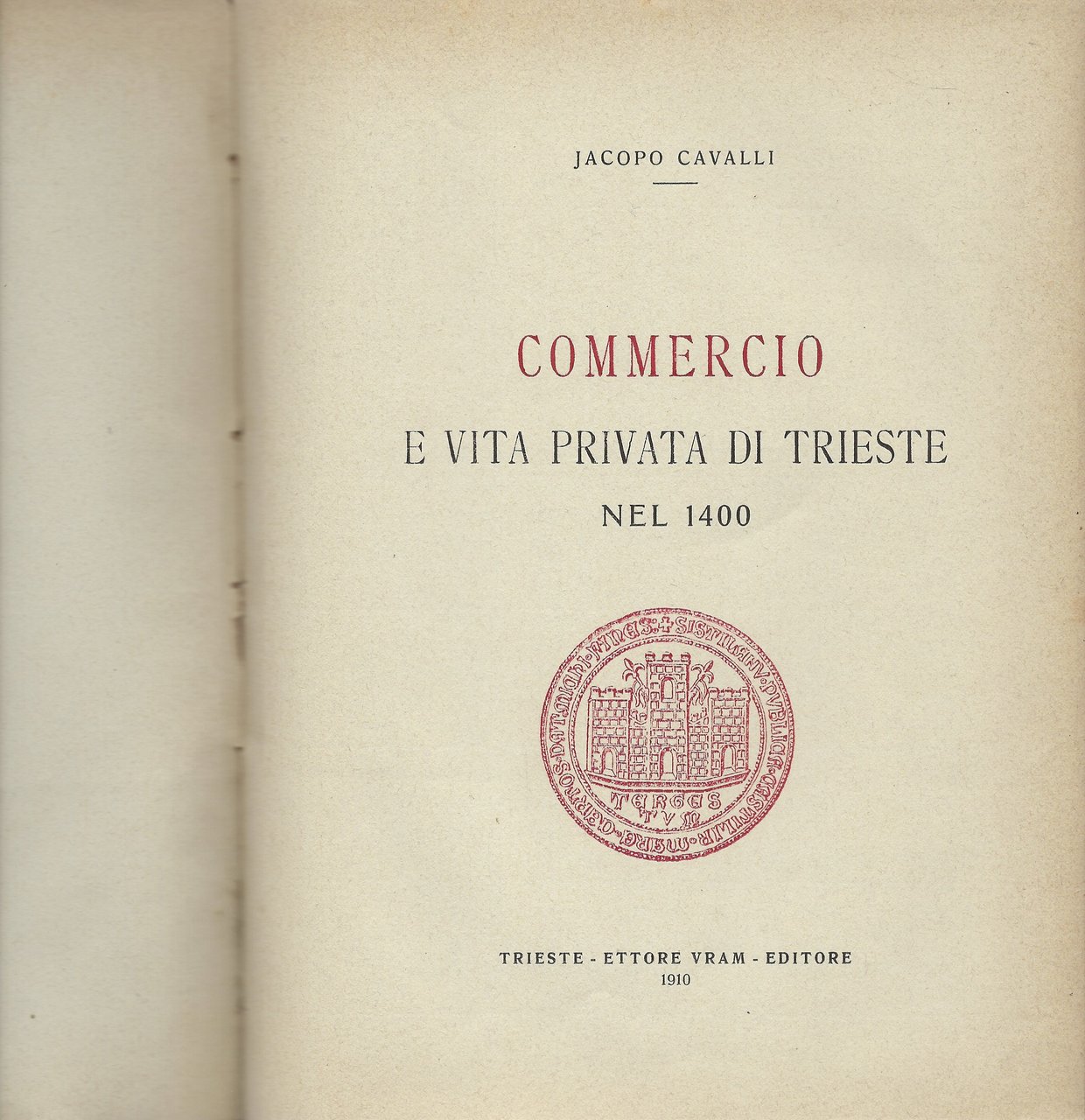 Marca al frontespizio in rosso, stemmi delle tredici casate f.t. e piantina topografica ripiegata di Trieste nel 1400 a colori (con un piccolo strappetto).