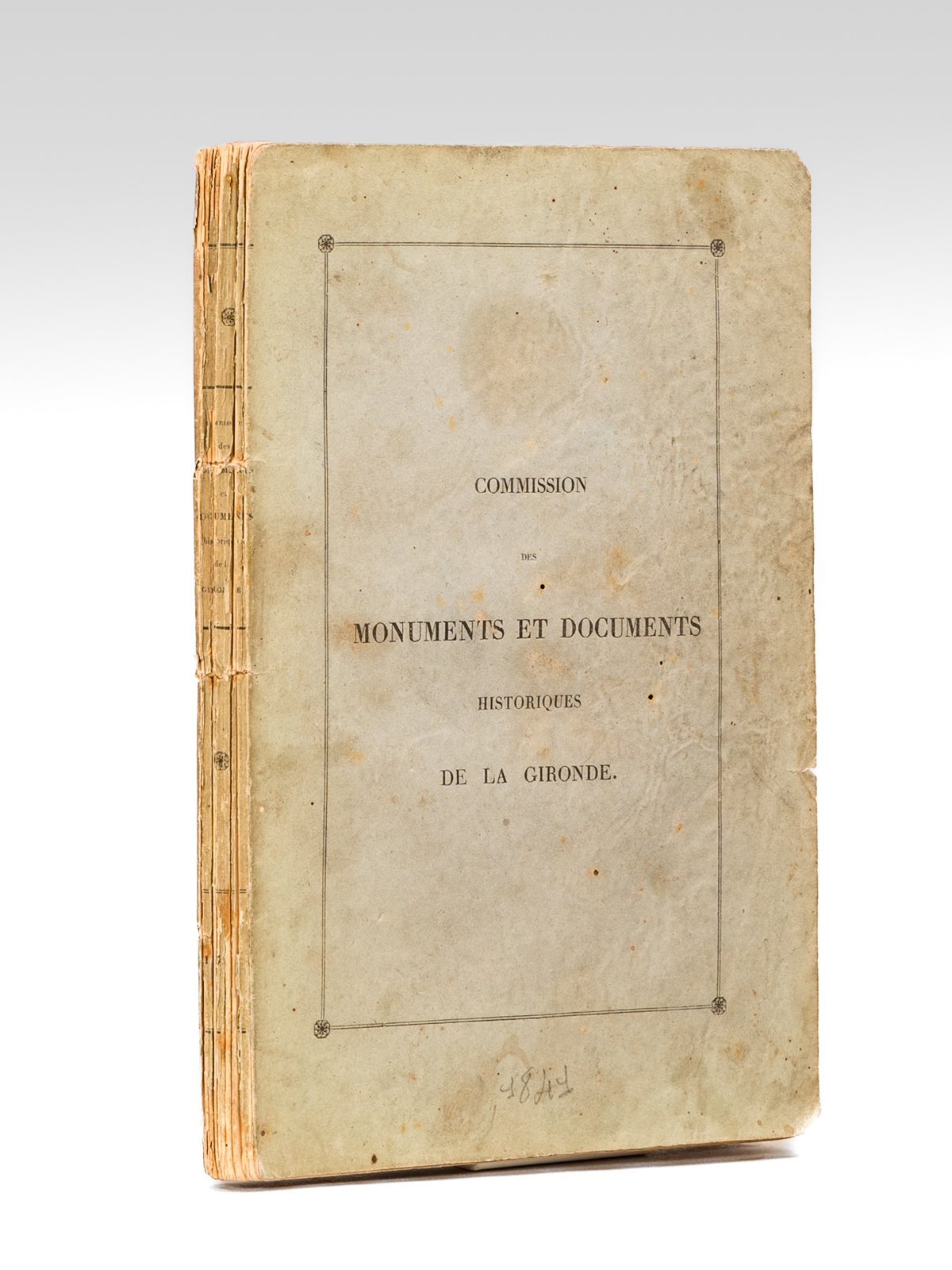 1 vol. in-8 br., Deliège Aîné, imprimeur de la Préfecture, Bordeaux, 1841, 171 pp. Très intéressant rapport, le second présenté par la commission après celui de 1839. "Sous le rapport des travaux descriptifs, je signalerai particulièrement une excellente notice sur l'église de Bayon, par le maire de cette commune ; une description des ruines du château d'Ornon et de l'ancien prieuré de Cayac, ainsi que des aqueducs romains de cette localité, par le maire de Gradignan. Parmi ceux qui ont envoyé d'utiles renseignements, je placerai ici les noms des maires d'Ambarès, de Labrède, de Gujan, de Cabanac et Villagrins, de Brannens, de Bernos, de Saint-Vivien (Médoc), de Cursan, de Bourg et de Pléneselve [ . ] M. le curé de Saint-Michel, à Bordeaux, nous a priés d'explorer et de décrire la crypte de son église et les archives de sa fabrique [ etc. etc. ]". Etat satisfaisant (dos fendu et faible, bon état par ailleurs)