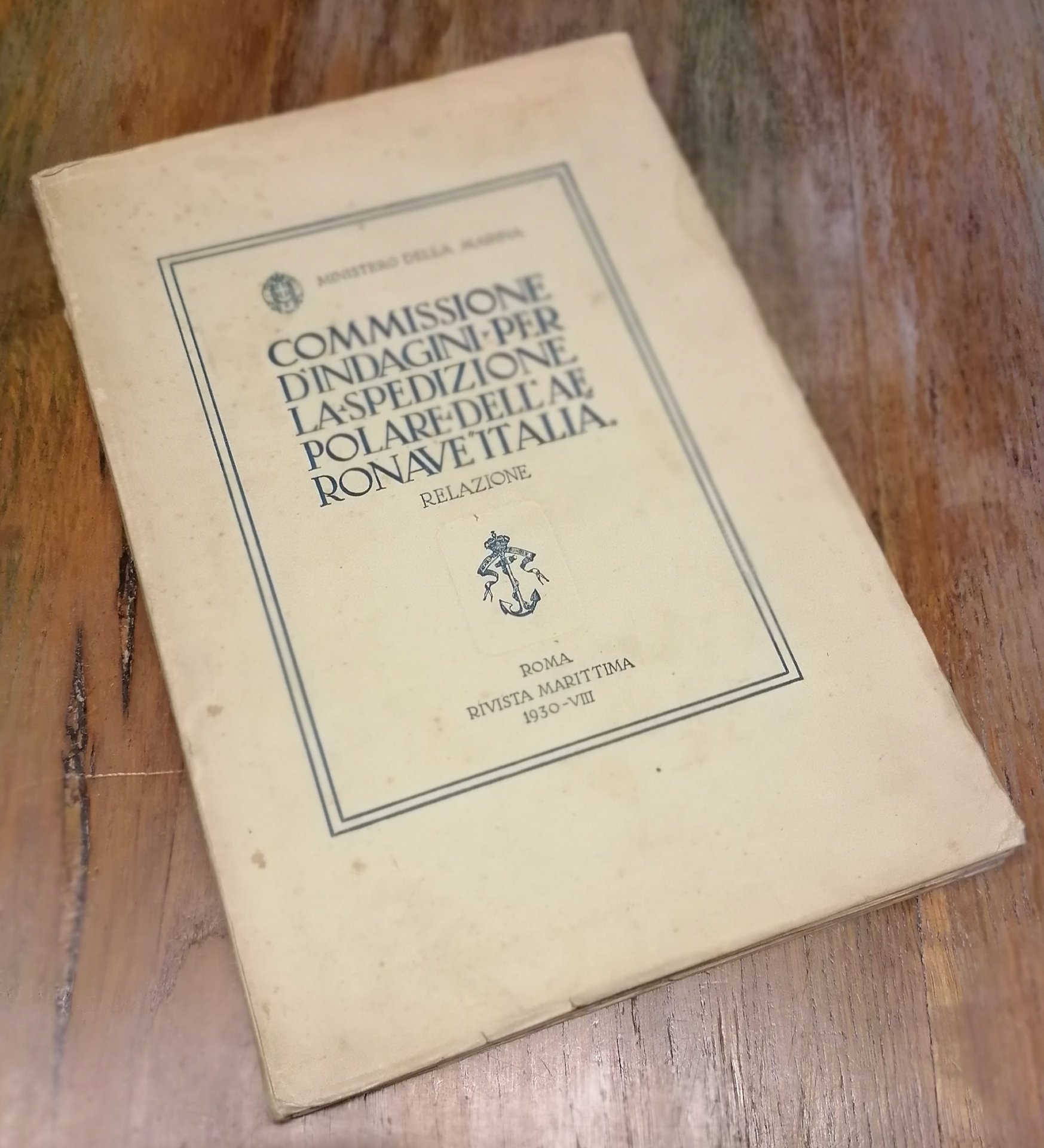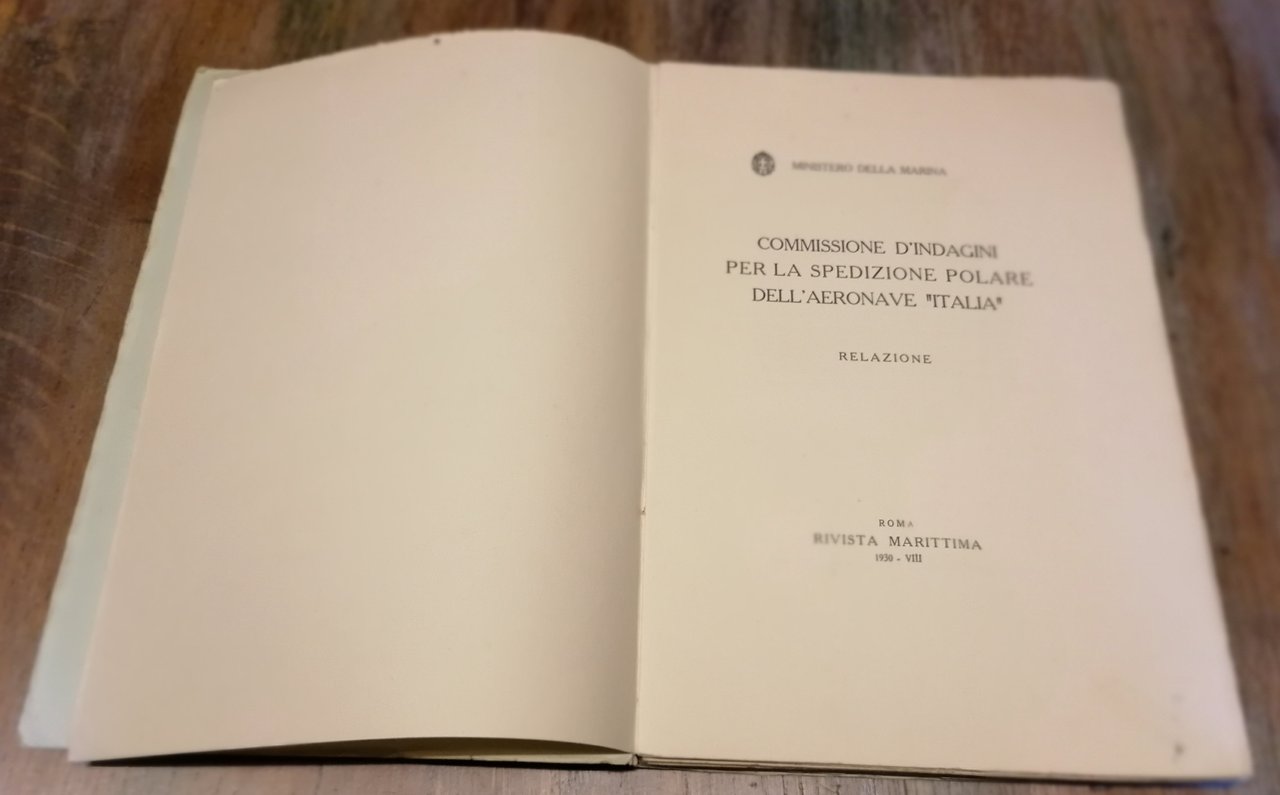 (Esplorazione delle regioni artiche - Polo Nord - Umberto Nobile - Aeronautica) In 4° (cm 32,5x22,5), brossura editoriale grigia con titoli e fregio a stampa entro cornice in blu, pp. 138, con 11 tavole fuori testo di cui 5 ripiegate. Nell'autunno del 1928 fu nominata, per ordine di Mussolini, una Commissione d'indagine (composta da Umberto Cagni, Francesco Pujia, Francesco De Pinedo, Nicola Vacchelli, Salvatore Denti Amari di Pirajno, Pietro Achille Cavalli Molinelli e Michele Vocino) con l'incarico di esaminare le cause determinanti la perdita dell'aeronave "Italia", comandata da Umberto Nobile, e lo svolgimento delle operazioni di salvataggio. In seguito a commenti poco favorevoli della stampa estera circa il drammatico epilogo della spedizione, il Governo italiano autorizzò la pubblicazione dell'intera relazione della Commissione. Leggere tracce di ossidazione alla brossura ma volume ben conservato.