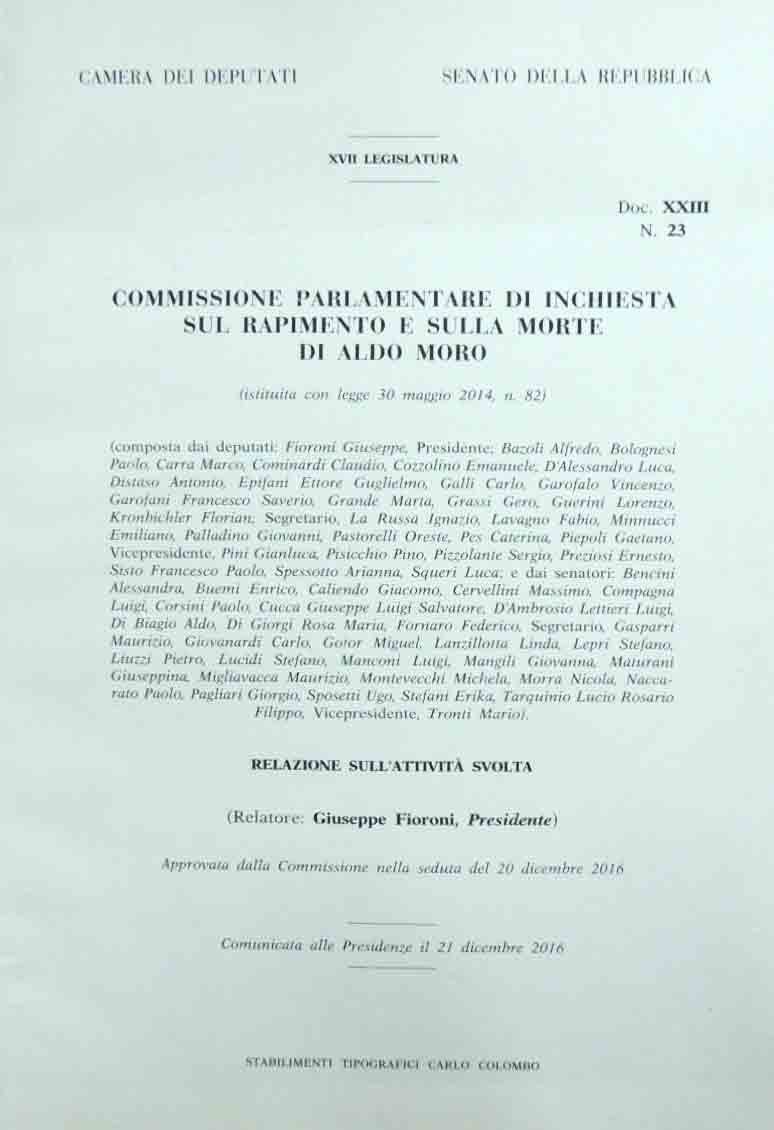 Commissione parlamentare di inchiesta sul rapimento e sulla morte di Aldo Moro. (Istituita con legge 30 maggio 2014, n. 82). (Composta dai deputati: Fioroni Giuseppe et al.). Relazione sull’attività svolta. Relatore Giuseppe Fioroni, Presidente. Approvata dalla Commissione nella seduta del 20 dicembre 2016. Comunicata alle Presidenze il 21 dicembre 2016, Stabilimenti Tipografici carlo Colombo, s.l., s.d. (2017?), pp. 162, cm 30, br. ed. In testa al frontespizio: Camera dei Deputati – Senato della Repubblica – XVII Legislatura – Doc. XXIII, n. 23. Dedica autografa alla prima carta di testo. Perfetto.