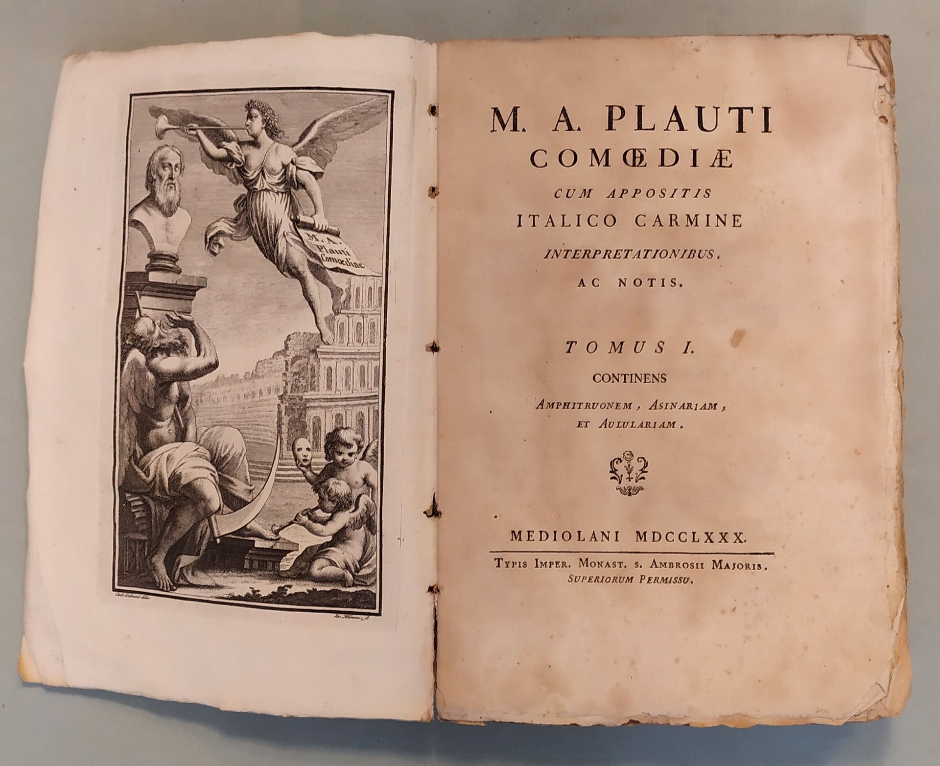 Mediolani, Monast. S.Ambrosi Majoris, 1780-1788. Sette volumi in 8vo. Intonso. Copertine originali, dorsi laceri. Al primo volume antiporta allegorica incisa in rame da Iac. Mercorus da un disegno di Carlo Galeazzi. Tutto il teatro di Plauto.