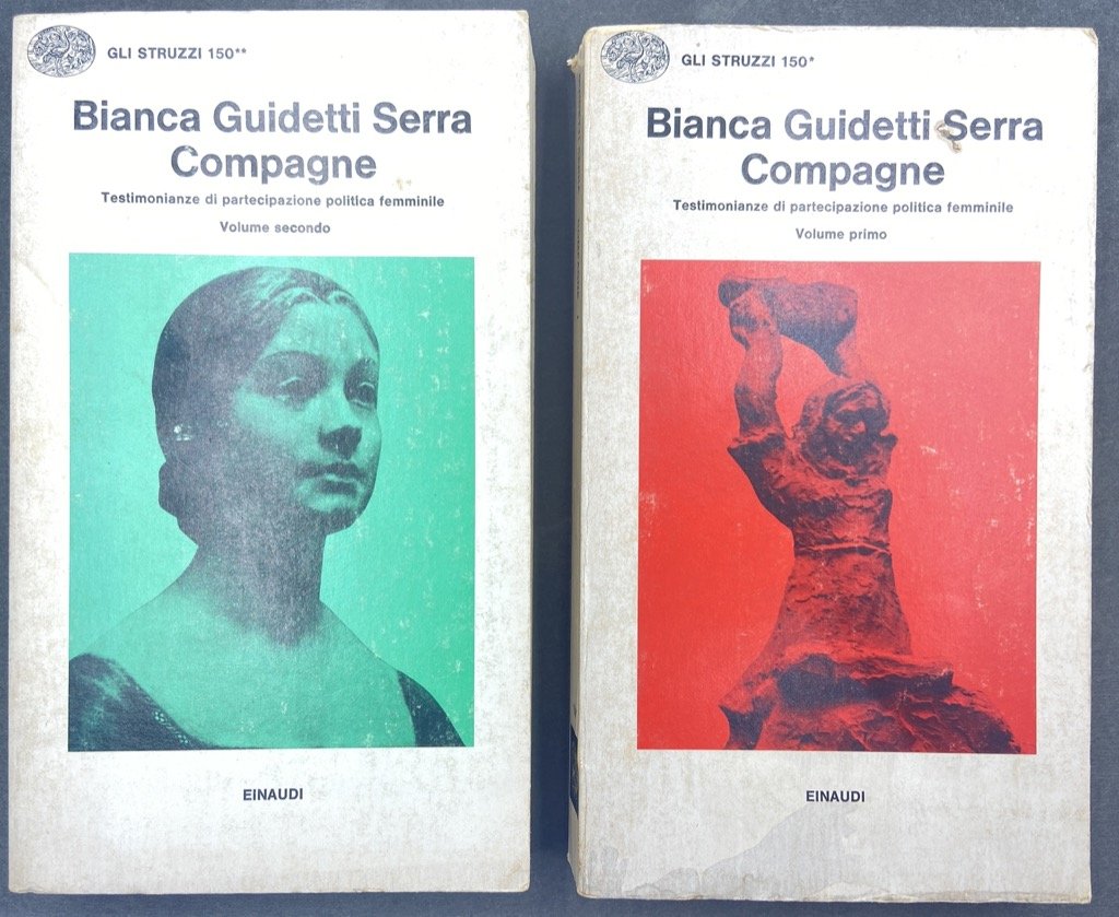 Due volumi in brossura editoriale illustrata, cm 19.5 x 11.5, pp XX 659 (3) in numerazione continua. Collana Gli struzzi, numero 150. Esemplare da studio, completo e leggibile ma con copertine usurate. Edizione originale di questo lavoro che raccoglie una cinquantina di interviste a donne operaie e antifasciste, per lo più torinesi, che raccontano le loro vite e lotte dai primi moti contro la guerra tra il 1914 e il 1917 alle occupazioni del 1920, dagli scioperi del 1943 alla Resistenza, dalla repressione durante la guerra fredda alle nuove proteste e al femminismo del 1968. Bianca Guidetti Serra fu attivista comunista, partecipò alla Resistenza e alla formazione dei Gruppi di Difesa della Donna, si impegnò nell'UDI e nella Camera del Lavoro; dagli anni '50 esercitò la professione di avvocato privilegiando la difesa di soggetti deboli, operai, donne, carcerati, minori.