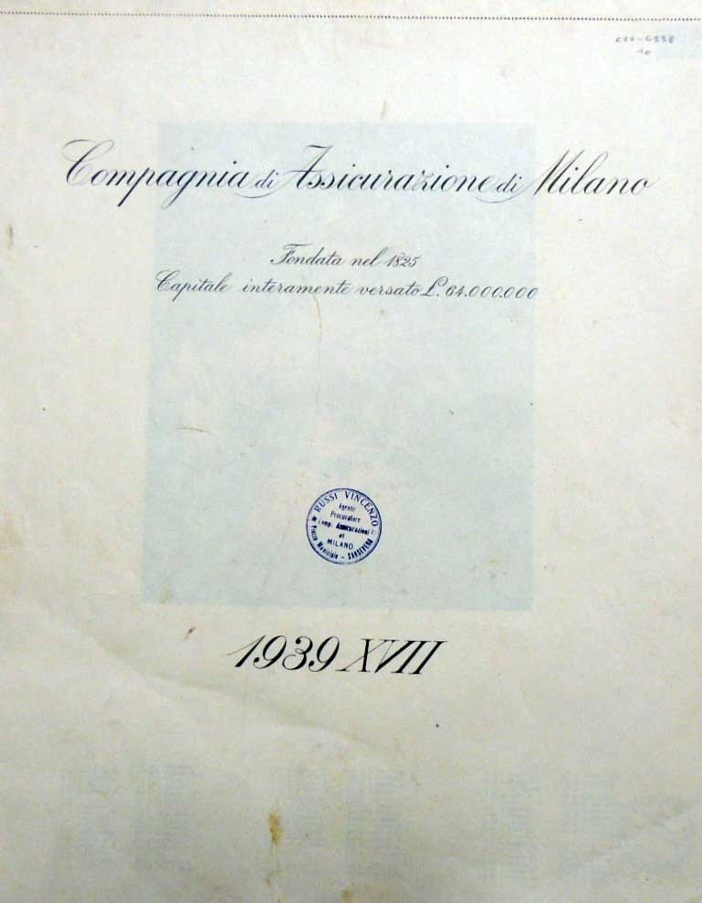 Compagnia di Assicurazione di Milano. Fondata nel 1825. Capitale interamente versato L. 64.000.000. 1939 XVII, s.n., s.l. (ma stampato a Milano, presso la S. A. Alfieri e Lacroix) s.d. (ma 1938), bel calendario per l’anno 1939 costituito da 6 carte non numerate di cui 2 c. di copertina e 4 c. di tavv. in cartoncino ill. col. e riportanti tre mesi ciascuna, cm 44, rilegatura ed. a punto metallico con cordoncino decorativo. Calendario della Compagnia di Assicurazione di Milano per l’anno 1939 costituito da 2 carte di copertina e da 4 c. di tavv. interne riportanti ciascuna tre mesi dell’anno e una ill. col. di grande formato. Le illustrazioni a colori, di formato cm 22x18 e di splendida fattura, riproducono, una per tavola, dame con costumi dei secoli XV-XVII. Su ciascuna carta e tavola, timbro Agenzia di Assicurazione di Sansevero. Tracce d’uso alla copertina, per il resto ben conservato.