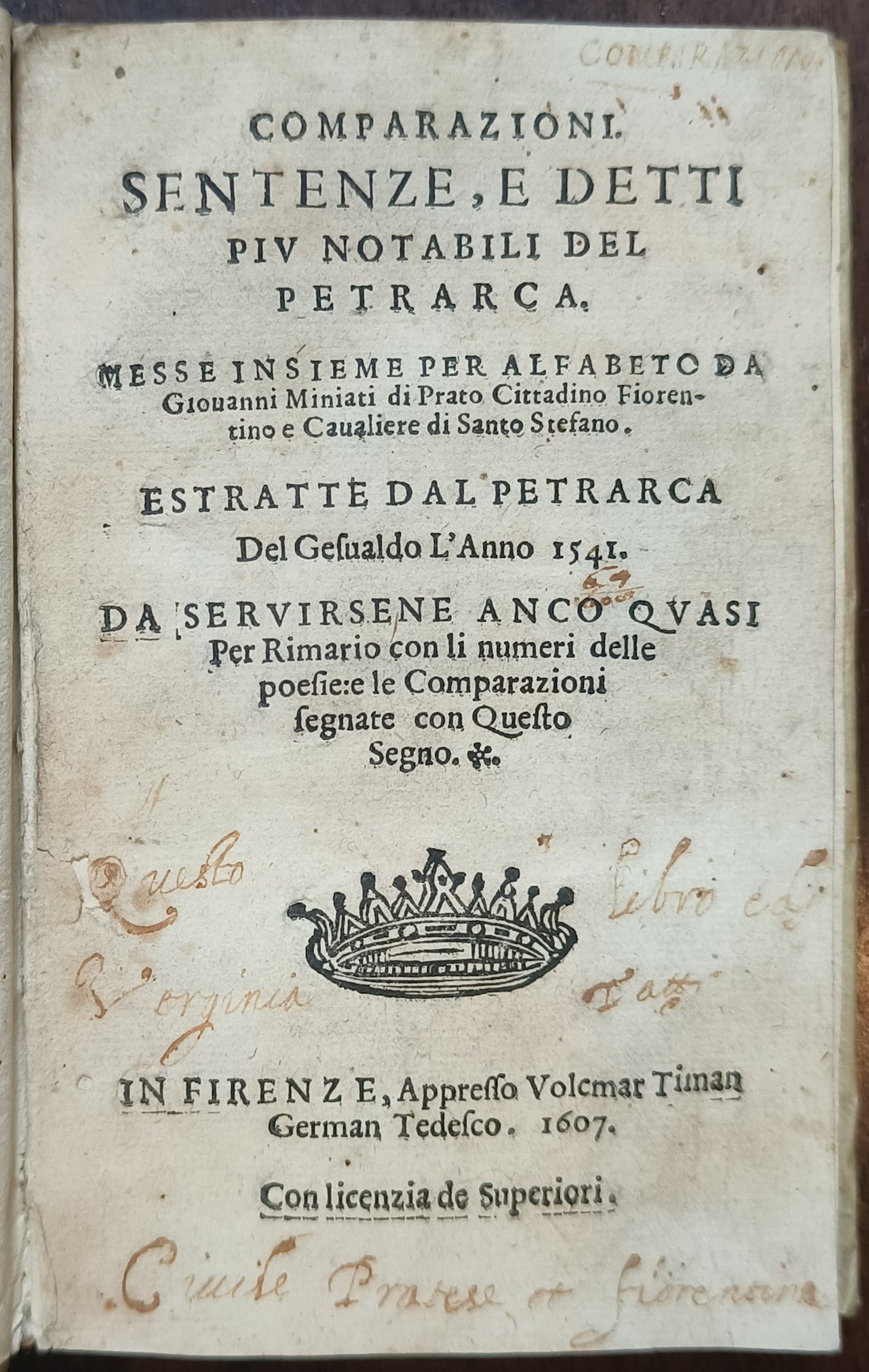 COMPARAZIONI SENTENZE, E DETTI PIU NOTABILI DEL PETRARCA, MESSE INSIEME PER ALFABETO DA Giovanni Miniati di Prato Cittadino Fiorentino e Cavaliere di Santo Stefano. ESTRATTE DAL PETRARCA Del Geſualdo L'Anno 1541. DA SERVIRSENE ANCO QVASI Per Rimario con li numeri delle poefiere le Comparazioni ſegnate con Questo Segno. IN FIRENZE, Appresso Volcmar Timan German Tedesco. 1607. Con licenzia de Superiori.
