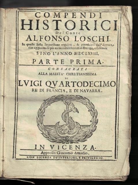 Compendi Historici. Del conte Alfonso Loschi. In questa sesta impressione regolati, & accresciuti dall’Autore con aggiunta de più memorabili successi di Europa, e Levante sino l’anno 1668. Parte prima. Consacrati alla Maestà Christianissima di Luigi Quartodecimo Re di Francia, e di Navarra / Comentari di Roma, e Serie degl’Imperatori sino a Leopoldo Ignatio Augustissimo Regnante. Del conte Alfonso Loschi. Parte seconda delli Compendi Historici. Con la descrittione del viaggio dell’Augustissima Imperatrice a Vienna, et le Capitulazioni di Pace trà le Corone / Vite degli imperatori d’Oriente e di Occidente.