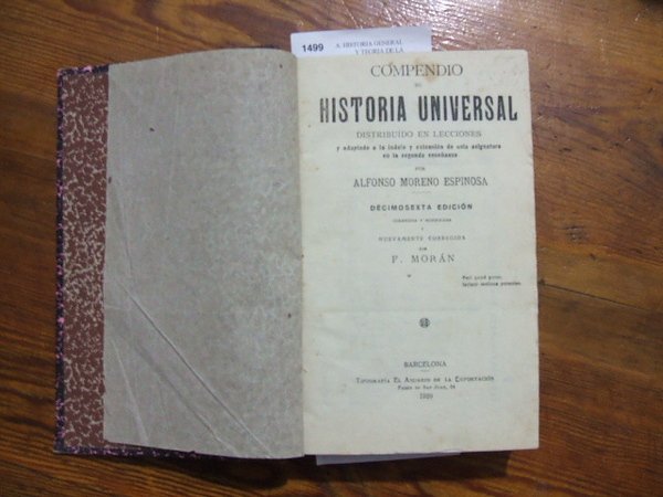 MORENO ESPINOSA, Alfonso Compendio de Historia Universal distribuido en lecciones. y adaptado a la índole y extensión de esta asignatura en la segunda enseñanza por --- Tip. El anuario de la Exportación. Barcelona 1920 16ª ed. 500 p. (19 cm) Enc. holandesa. A (Ref.1499) historia universal general texto manual escolar