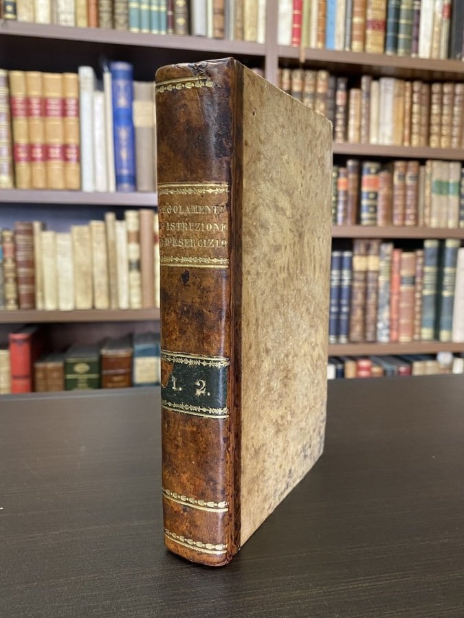 <span style="font-style: normal; font-family: Arial, Verdana; font-size: 10pt; font-variant-caps: normal; font-weight: normal;">2 volumi in 1 in-8° (cm. 17,9), legatura coeva in mezza bazzana, dorso liscio con titolo in oro su doppio tassello, filetti e fregi sempre in oro (restauro professionale alla cerniera), piatti marmorizzati; pp. [8] 87 [1b] con 4 tavole fuori testo, XX 280 con 8 tavole fuori testo, in stato molto buono (lievi fioriture sparse, brunitura alle sole prime carte). Rara traduzione a cura di Carlo Pides, tenente del Reggimento Maria Luigia, che poi ebbe parte attiva nei moti del 1831, e istruì la gioventù nel maneggio delle armi durante la rivolta [</span><span style="font-family: Arial, Verdana; font-size: 13.333333px; font-variant-caps: normal; font-weight: normal;">Cfr. O. Masnovo, <i>Patrioti del 1831</i>, in </span><i style="font-family: Arial, Verdana; font-size: 13.333333px; font-variant-caps: normal; font-weight: normal;">Archivio Storico per le Province Parmensi</i><span style="font-style: normal; font-family: Arial, Verdana; font-size: 13.333333px; font-variant-caps: normal; font-weight: normal;"> 1937, 198]</span><span style="font-style: normal; font-family: Arial, Verdana; font-size: 13.333333px; font-variant-caps: normal; font-weight: normal;">. Esemplare </span><font face="Arial, Verdana" size="2" style="font-style: normal;">molto buono. (NP6)</font>