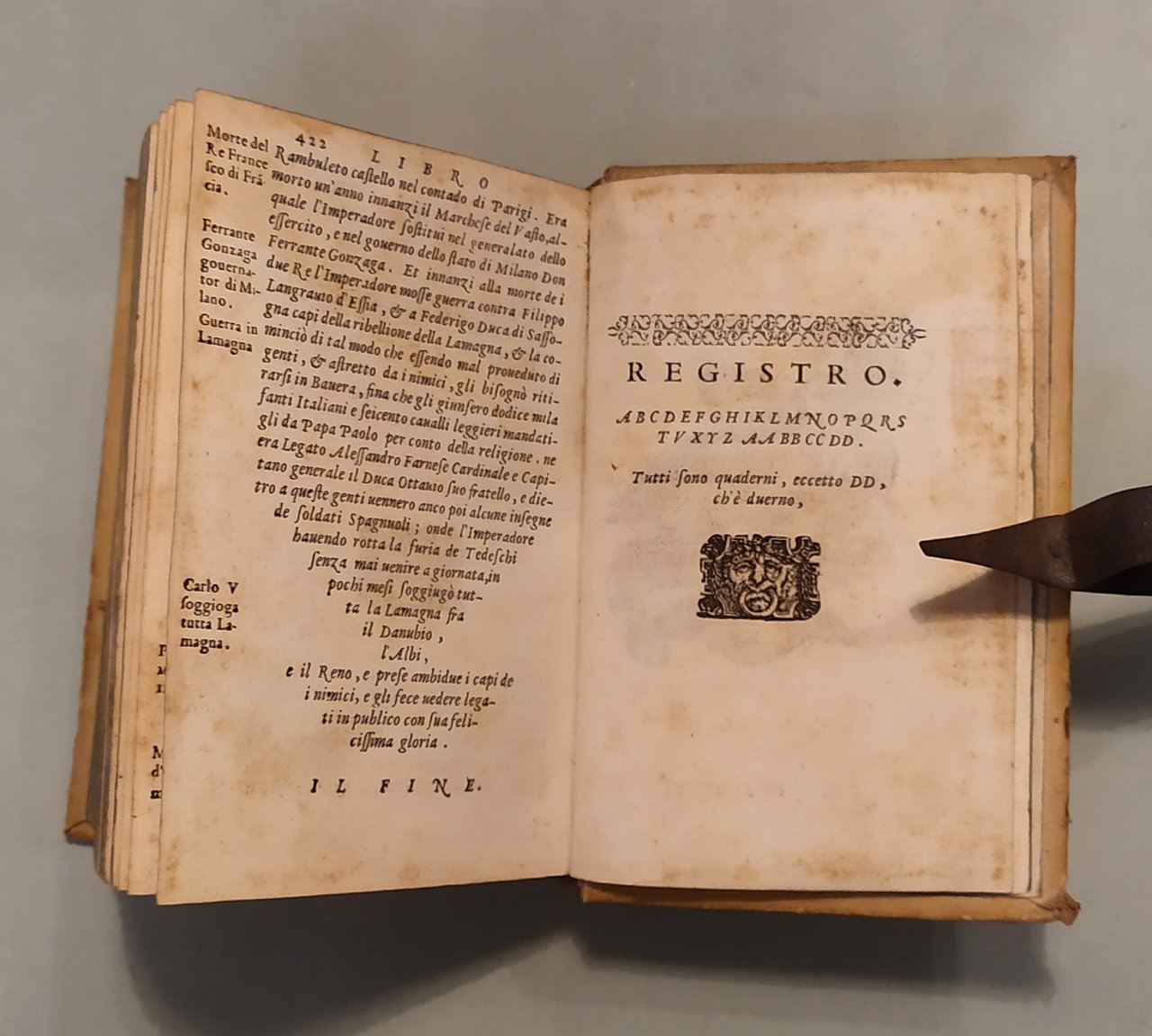 In Vinegia, appresso Gabriel Giolito de' Ferrari, 1562. In 16mo; pp.28 n.nn., 422, 2 n.nn. con registro ed insegna tipografica. Capilettera figurati. Pergamena coeva, tassello al dorso con titolo e fregi in oro. Edizione originale. Adams C, 782.