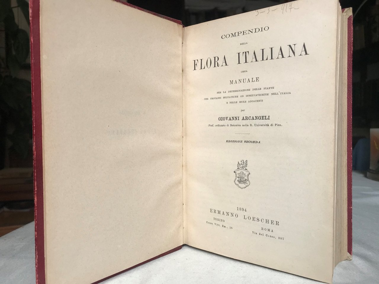 Volume in 8, legato in mezza pelle ornata da filetti e fregi impressi in oro, titolo inciso al dorso, sguardie, frontespizio, introduzione, quadro degli ordini naturali, XX, 836 pp., comprensive di indici, correzioni ed aggiunte, bianca finale. Seconda edizione, piuttosto rara, di questo studio sulla flora dell'Arcangeli, illustre botanico e professore all'universit di Pisa. Un prezioso compendio per gli studiosi di botanica, usato come riferimento in molte future pubblicazioni. Completo e di facile consultazione, in pi che buono stato di conservazione, alcuni nomi sottolineati e piccole annotazione di studio in matita rossa e blu. Importante e di difficile reperibilit.