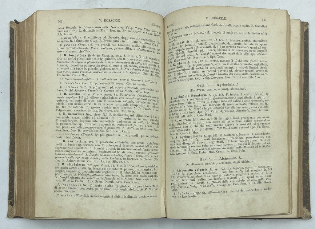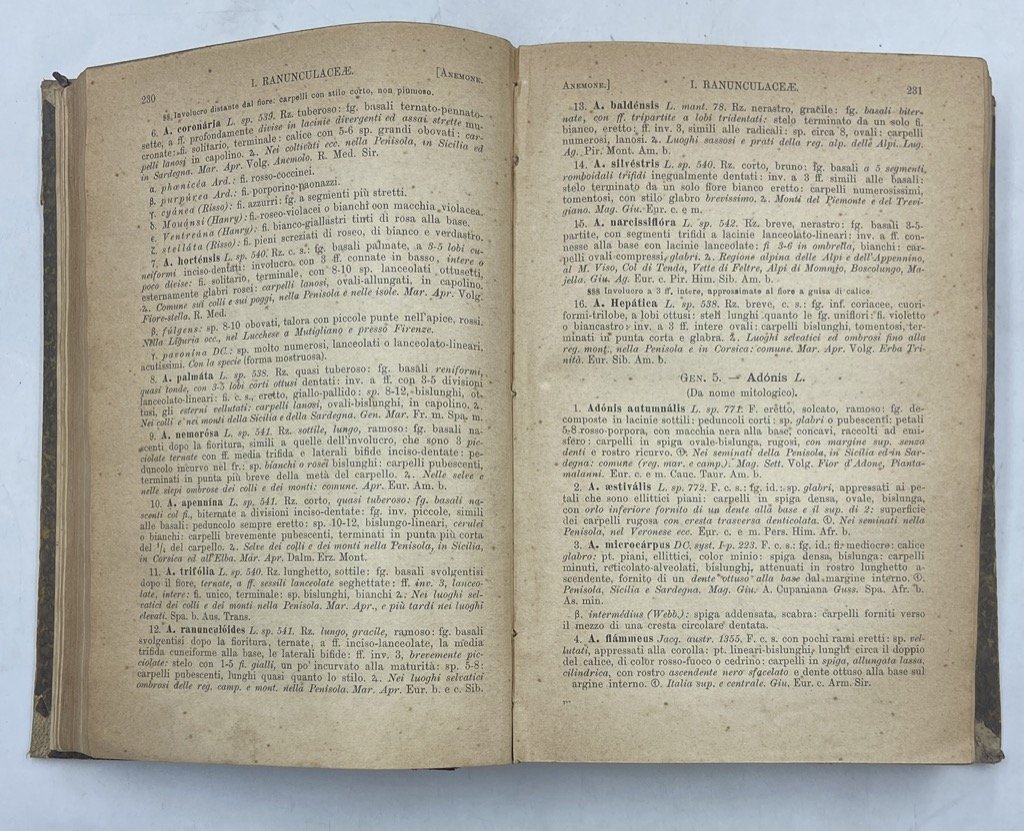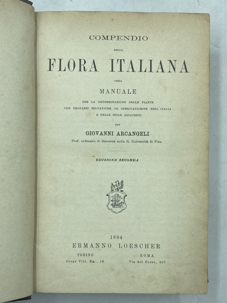 Legatura coeva in mezza pelle (qualche leggera abrasione), in ottavo cm 20 x 14, pp 836. Antica firma di proprietà sulla prima sguardia. Seconda definitiva edizione di questo apprezzatissimo manuale, stimato per la «brevità e chiarezza delle diagnosi e per la scelta dei caratteri diagnostici dei generi e delle specie» e apparso per la prima volta nel 1882. Professore di botanica e direttore dell'Orto botanico di Pisa (e per un breve periodo titolare delle stesse cariche a Torino), socio dell'Accademia delle Scienze e dei Lincei, Giovanni Arcangeli fu autore di numerosissime memorie dedicate a molteplici aspetti del regno vegetale, e di un Compendio di botanica dedicato ai suoi studenti.