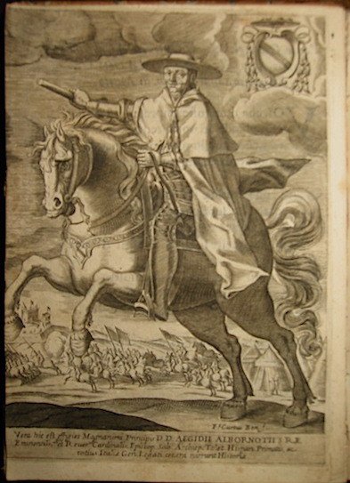 4to (cm. 20), 16 cc.nn., 212 pp. Ritratto calcografico del cardinale Albornoz e stemma della città di Bologna al frontespizio, entrambi incisi da Francesco Curti. Legatura ‘800 in mz. pelle con fili, fregi e titolo impresso in oro al ds. (minimi segni d’usura ai piatti). Tagli scuri. Ex libris ‘Cristoforo Scotti’ al contropiatto anteriore. Occasionali aloni marginali e fioriture, ma esemplare in più che buono stato di conservazione. Raro. Il Cardinale Egidio Albornoz fu incaricato di riconquistare i territori sottratti al Pontefice da Giovanni di Vico, prefetto di Roma e Signore di Viterbo, nell’alto Lazio, in Umbria, nella Marca anconitana ed in Romagna. Vinciana, 627.