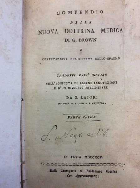 COMPENDIO DELLA NUOVA DOTTRINA MEDICA. - E confutazione del sistema dello spasmo. Tradotti dall'inglese coll'aggiunta di alcune annotazioni e d'un discorso preliminare da G. Rasori.