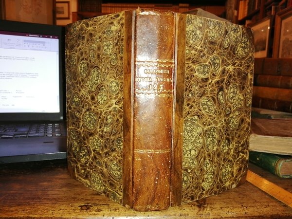 In-8 (19 cm) 3 voll. in uno (4) 192, (4) 178, (4) 167 (1). Occhietto con titolo: "Compendio della storia d'Inghilterra dalla invasione di Giulio Cesare fino alla spedizione de' Francesi in Egitto ed alla battaglia navale d'Aboukir ". Legatura in mezza pelle, con piatti cartonati rivestiti di carta marmorizzata. Tagli gialli. Goldsmith Oliver (1728-1774): scrittore, poeta e drammaturgo. Nato a Pallas, Longford e morto a Londra. Qualche fioritura.