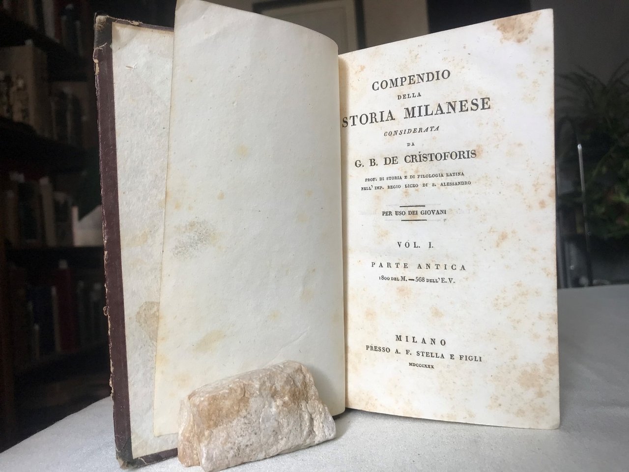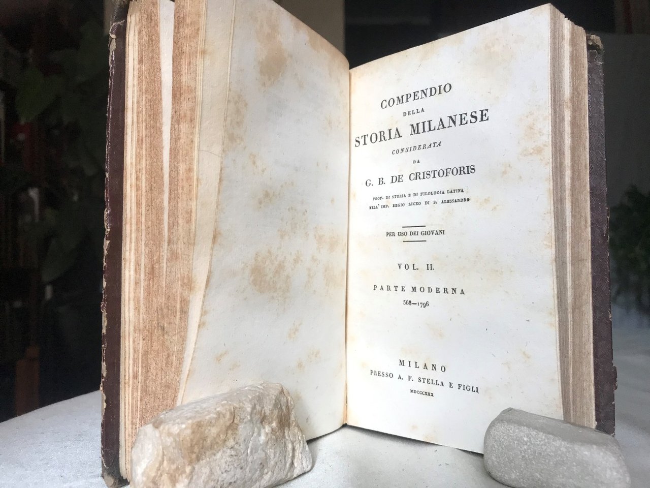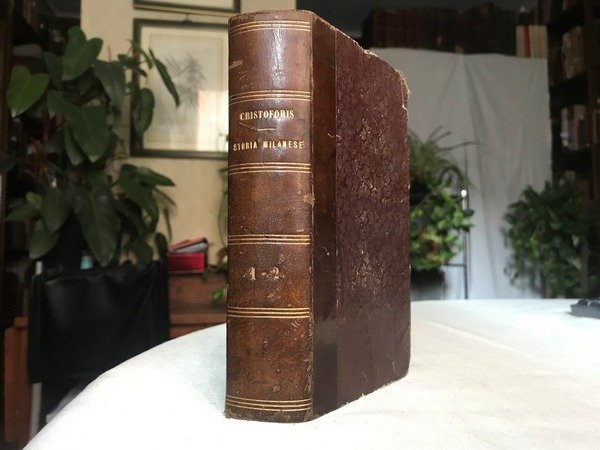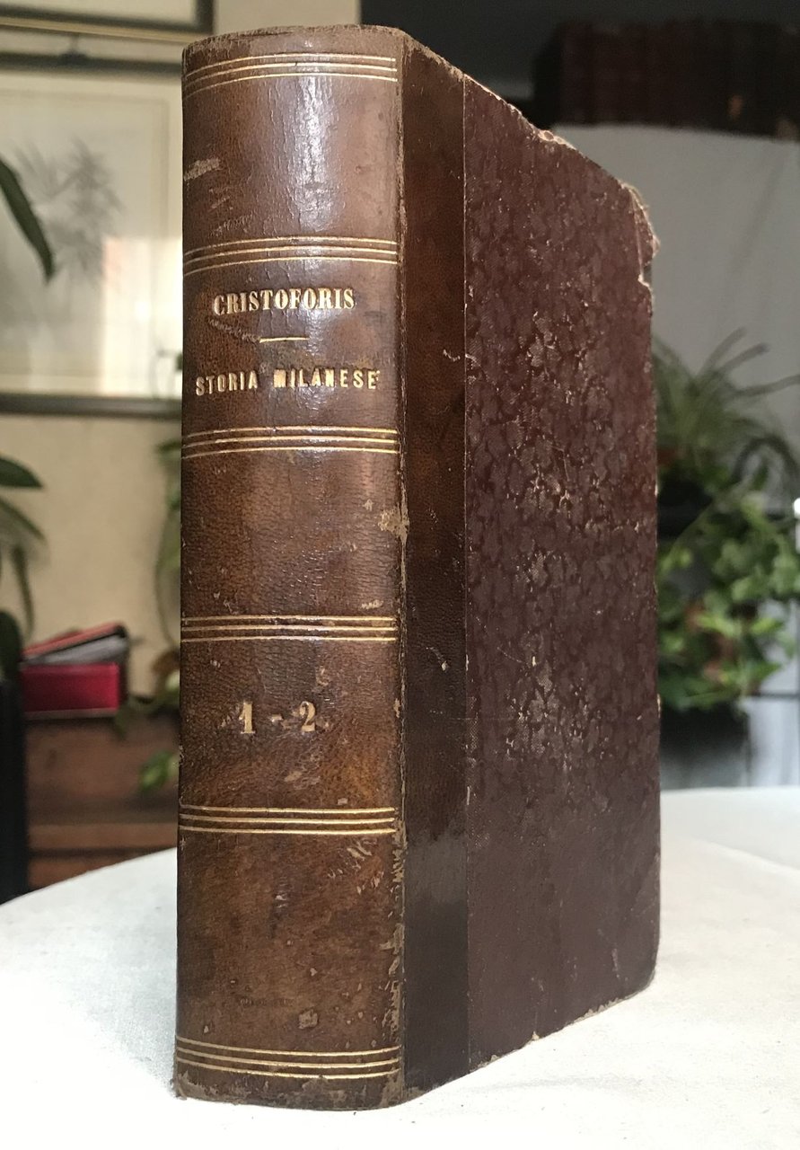 Due volumi in un tomo in 8piccolo, legatura coeva in mezza pelle, titolo al dorso ornato, sguardie, frontespizio, dedicatoria, prefazione, VIII, 233 pp., comprensive di indice, secondo volume di 319 pp. ed indice. L'opera tratta la storia di Milano dal primo dominio dei Galli, a quello degli Eruli e dei Goti per passare al dominio longobardo sino al primo della Casa d'Austria. In buono stato, rare fioriture della carta, non comune.