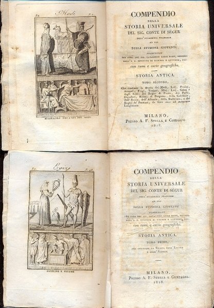10 voll., in 16°, cart. muta, ogni vol. è di ca. 200 pp. , con 27 inc. e 3 carte geografiche più volte ripiegate raffiguranti: Egitto antico; Magna Grecia; Atene, Sparta e Siracusa. Barbe. Lievi mende alle copp. Alcune pag. sciolte, collazionati. Antichi forellini che interessano alcune lettere. L'opera è composta dai primi nove voll. mentre il 10° è il secondo tomo dell'Indice Generale in cui sta aggiunto il catalogo ragionato delle storie scritte dagl'italiani nei primi venticinque anni del presente secolo XIX. Disp. dei soli voll. sopra descritti. T.A.