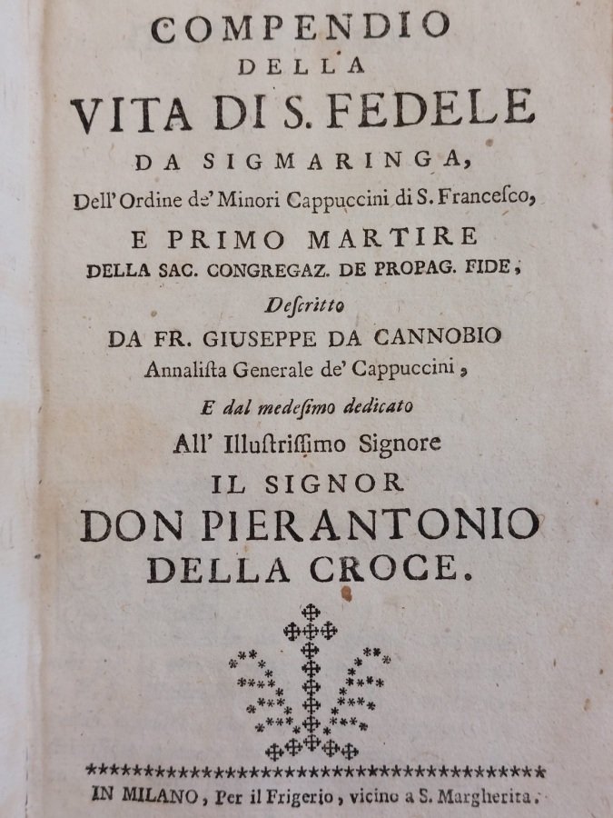 In-8° (cm. 17,4), legatura coeva in piena pergamena con titolo anticamente manoscritto al dorso (lievi tracce d'uso), tagli spruzzati in rosso; pp. [16] 207 [1] in ottimo stato (lievissime e sporadiche fioriture); con capilettera silografici. Edizione milanese di questa agiografia del missionario cappuccino tedesco (Sigmaringen, 1577- Seewis im Prättigau, 1622) ucciso durante una rivolta anti-austriaca in Svizzera e proclamato santo da Benedetto XIV nel 1746. Esemplare molto buono. (SL1)
