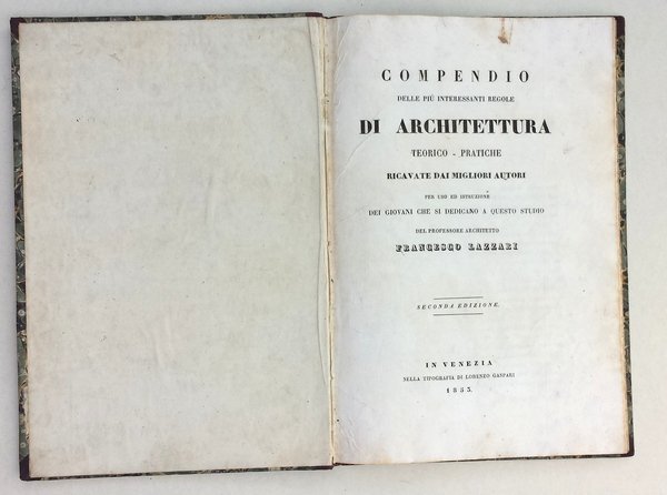 In-4 (29 cm) 61 (3) IV c. di tav. Mezza pelle con piatti marmorizzati. Fioriture leggerissime e solo nelle prie pagine. Dall'"Idea dell'opera": ".corso regolare e copleto di Architettura diviso nelle tre parti che riguardano la bellezza, la coodità, e la solidità, le quali senza dubbio costituiscono le basi fondamentali di ogni ben ordinato edifizio."