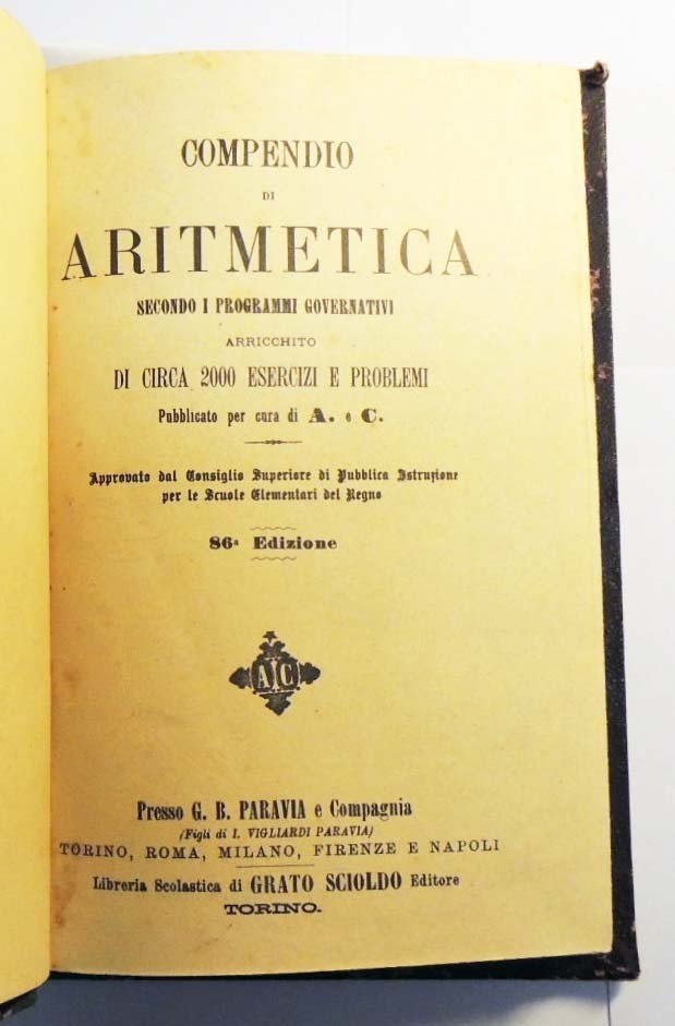 Compendio di aritmetica. Secondo i programmi governativi arricchito di circa 2000 esercizi e problemi, pubblicato per cura di A. e C., G. B. Paravia e Compagnia, Torino, Libreria Scolastica di Grato Scioldo Editore, Torino, 1908, pp. 196, ill. b.n., cm 19, mezza tela muta con tagli spruzzati. Legato con: Cesare De Titta, Grammatichetta italiana. Per uso delle classi elementari superiori, R. Carabba Editore, Lanciano 1907, pp. 112. Timbro d’appartenenza alla prima pagina di guardia, firma d’appartenenza all’interno della prima opera. Lievi tracce d’uso ai piatti, sporadiche annotazioni manoscritte e segnetti di biro,tre carte con restauri che non compromettono il testo, ma nel complesso ancora buon esemplare.