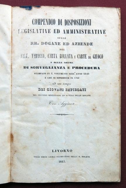 Compendio di disposizioni legislative e amministrative sulle RR. Dogane ed Aziende del Sale, Tabacco, Carta Bollata e Carte da Giuoco. E delle norme di sorveglianza e procedura. Stampato in quattro volumetti nell'Anno 1840 e che si riproduce in uno ad uso sempre dei giovani impiegati nel servizio sedentario ed attivo delle dogane. Con Aggiunte.