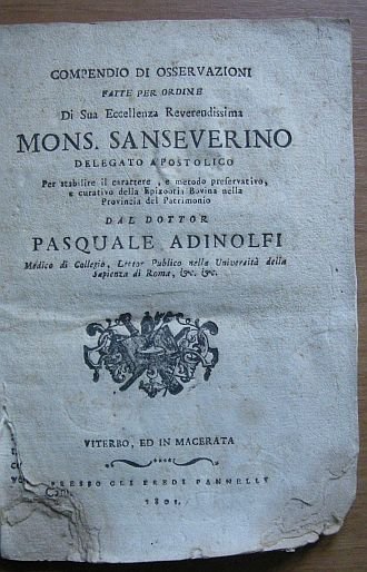 Compendio di osservazioni fatte per ordine di Sua Eccellenza Reverendissima Mons. Sanseverino Delegato Apostolico per stabilire il carattere, e metodo preservativo, e curativo della Epizootia Bovina nella Provincia del Patrimonio dal Dottor Pasquale Adinolfi.
