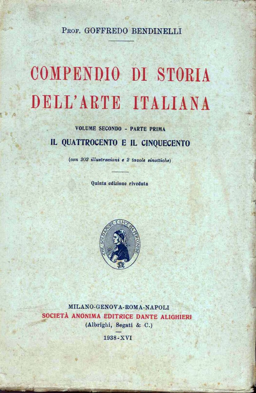 Compendio di storia dell'arte italiana vol. 2� parte prima, il quattrocento e il cinquecentoIn 8vo, br. ed., Qunita ed. riveduta con 202 ill e 2 tav. sinottiche, BUONO, quasi int. INTONSO