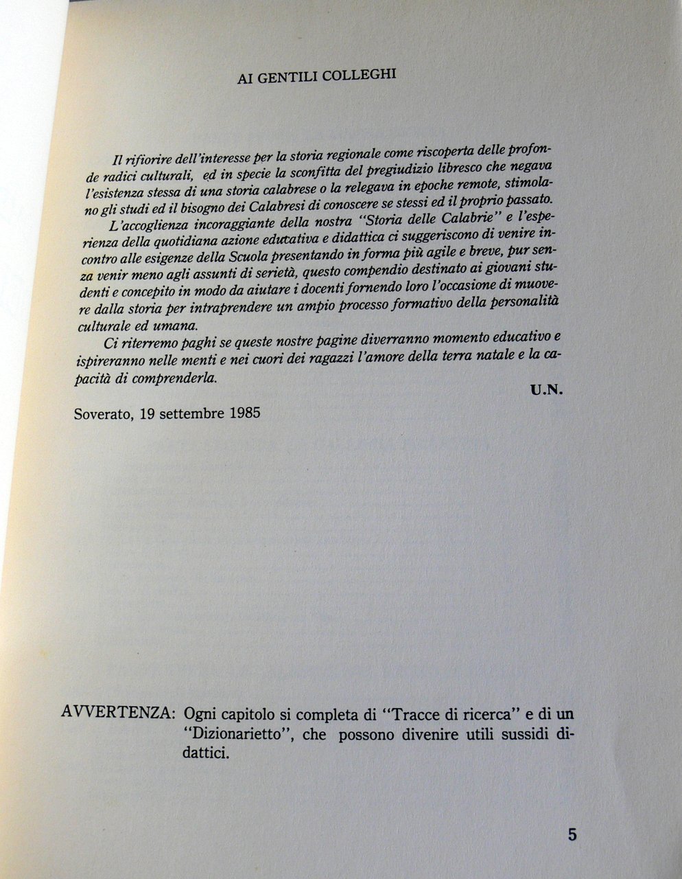 Il rifiorire dell'interesse per la storia regionale come riscoperta delle profonde radici culturali, ed in specie la sconfitta del pregiudizio libresco che negava l'esistenza stessa di una storia calabrese o la relegava in epoche remote, stimolano gli studi ed il bisogno dei Calabresi di conoscere se stessi ed il proprio passato. L'accoglienza incoraggiante della nostra Storia delle Calabrie e l'esperienza della quotidiana azione educativa e didattica ci suggeriscono di venire incontro alle esigenze della Scuola presentando in forma più agile e breve, pur senza venir meno agli assunti di serietà, questo compendio destinato ai giovani studenti e concepito in modo da aiutare i docenti fornendo loro l'occasione di muovere dalla storia per intraprendere un ampio processo formativo della personalità culturale ed umana. Ci riterremo paghi se queste nostre pagine diverranno momento educativo e ispireranno nelle menti e nei cuori dei ragazzi l'amore della terra natale e la capacità di comprenderla.