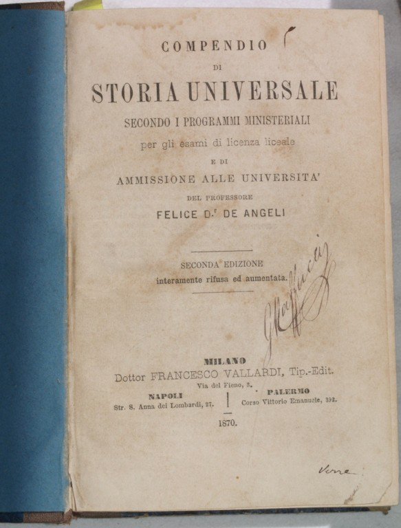 In 8. Dim. 19x13 cm. Pp. 676. Seconda edizione del 1870 di questo compendio di storia universale per gli esami del diploma di Felice de Angeli. L'autore narra gli eventi storici dal medioevo fino al 1870, l'anno di pubblicazione dell'opera. All'interno un albero genealogico sui discendenti di Pipino ed i Carolingi. Firma al frontespizio. Copertina in mezza tela in cattive condizioni generali con usure ai margini e dorso mancante. Legatura in buone condizioni. All'interno le pagine si presentano in buone condizioni con fioriture e mende. Second edition of 1870 of this resuming of universal history for the examinations of the high school by Felice de Angeli. The author talks about the historical happenings from the middle age until 1870, the year of pubblication of the work. Inside a genealogic tree about the discendents of Pipin and the Carolingi. Signature in the title page. Half cloth cover in bad general conditions with worn edges and spine missing. Binding in good conditions. Inside pages are in good conditions with foxings and usage signs.