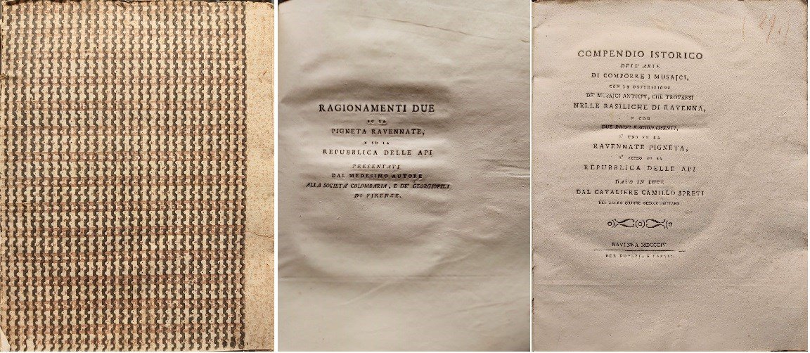 in-4, 1 cb, pp. (6), VII, 244 (le pp. 183-184 bianche), bella leg. cart. dec. coeva (mancanza al d.). Dedicat. a Giuliano Monaldini. Ediz. orig. Bella raccolta di testi dello storico scrittore ravennate (1793-1830): il primo sull'arte del mosaico con importanti esempi dati dai cicli delle chiese ravennati; il secondo sulla grande pineta litoranea di Ravenna e sua importanza; il terzo è un breve ma erudito trattato di apicoltura con citazioni da fonti classiche. Lozzi 3933: "Più che per la tecnica dei Musaici è interessante per le notizie storiche riguardanti l'arte in Ravenna, ove rispetto a quelli come può vedersi dai rimasti nel Mausoleo di Galla Placidia e nel Tempio di S. Vitale, toccò l'eccellenza". Esempl. a larghi margini su carta forte. [014]