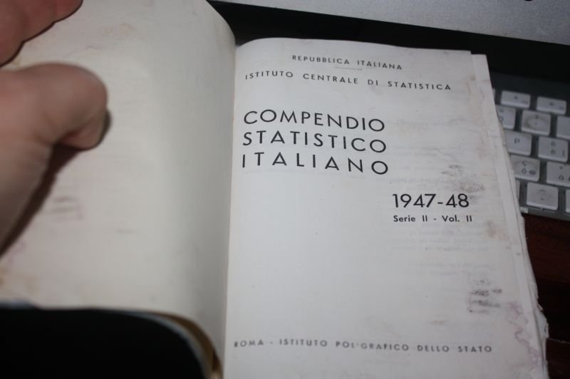 Cod 3296, , Compendio statistico italiano 1947 1948, , pag 206 seie II VOL.II, , macchie sulle copertine aloni sparsi dentro e fuori