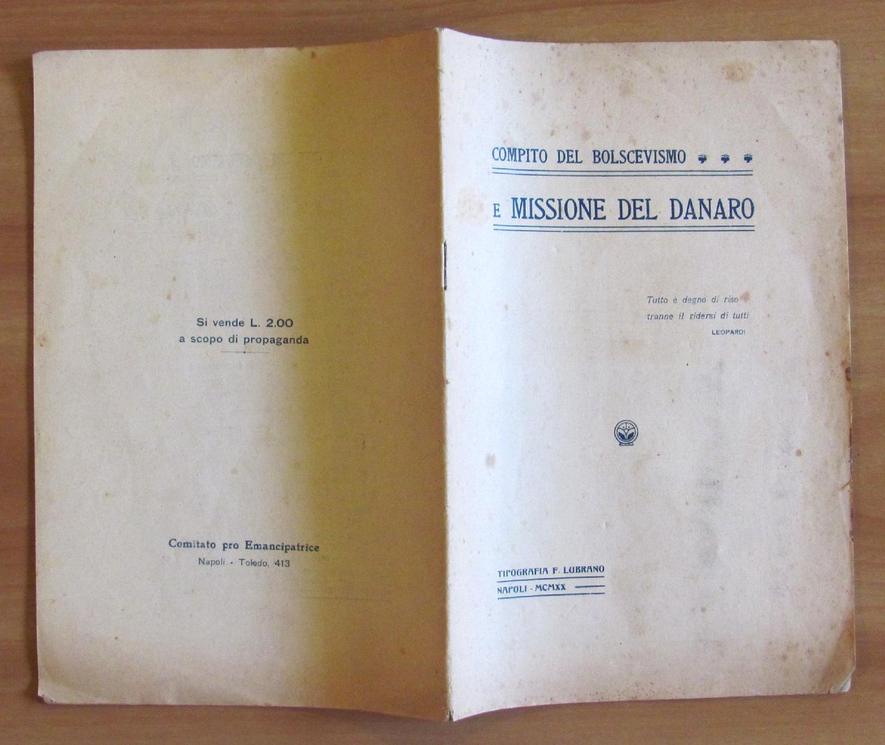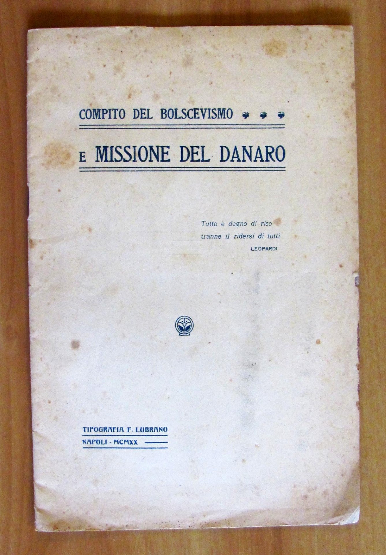 Tipografia F. Lubrano - Napoli, 1920. Brossura editoriale con minime fioriture del tempo alla sola copertina. 16x24,5; pp.32. Raro e in Ottimo stato. , Molto buono (Very Good)
