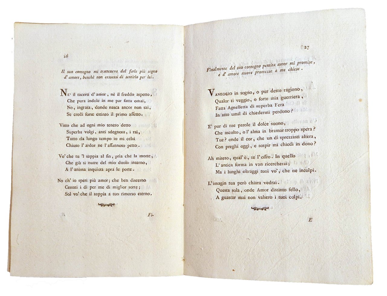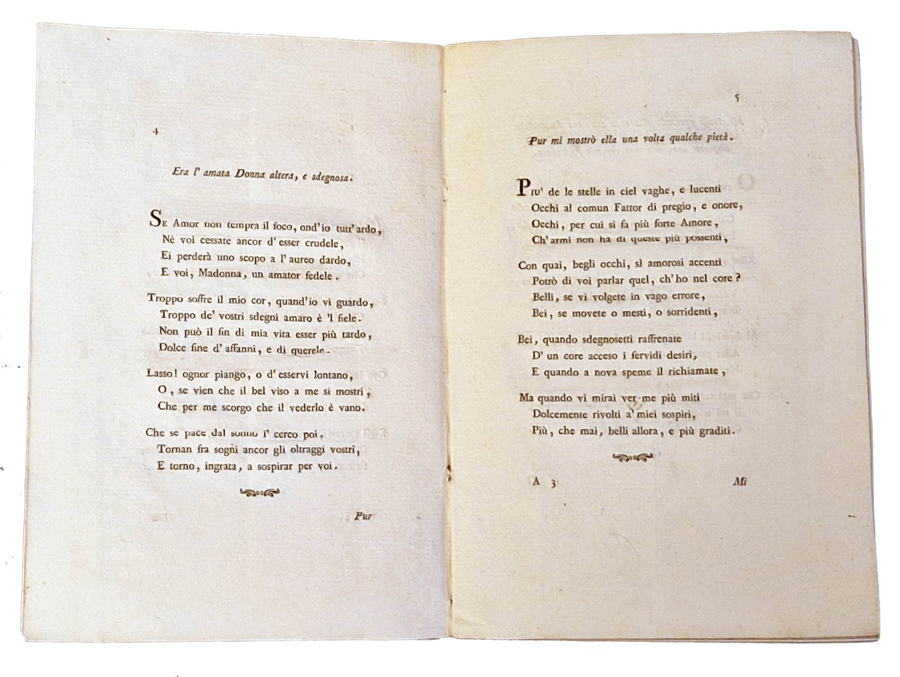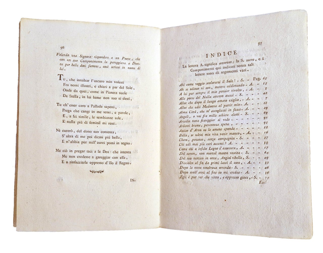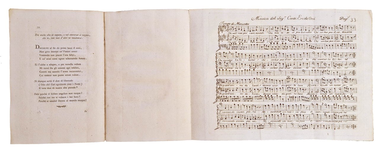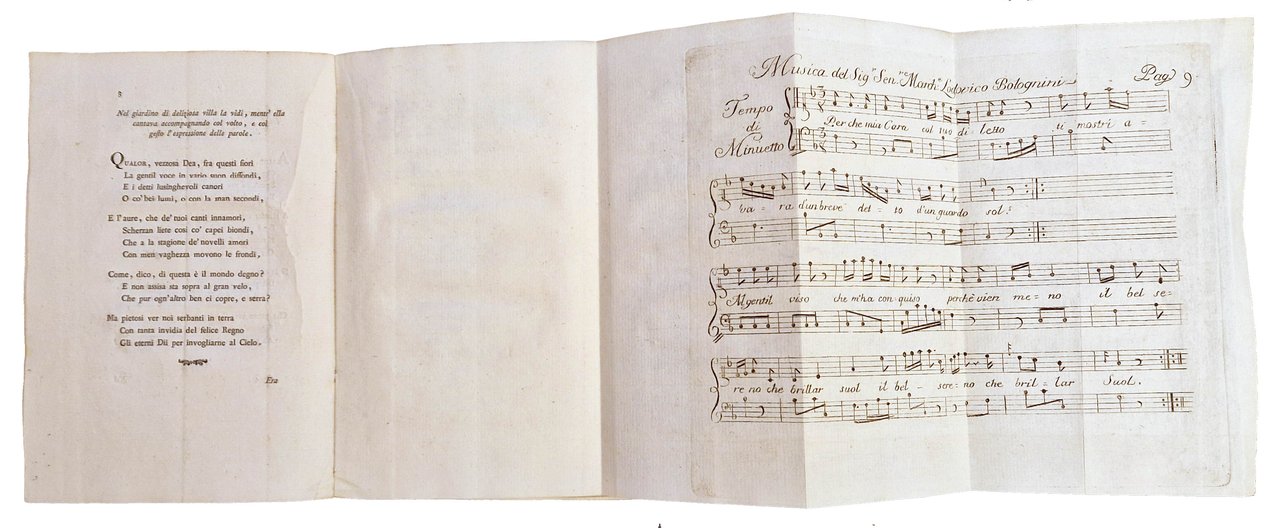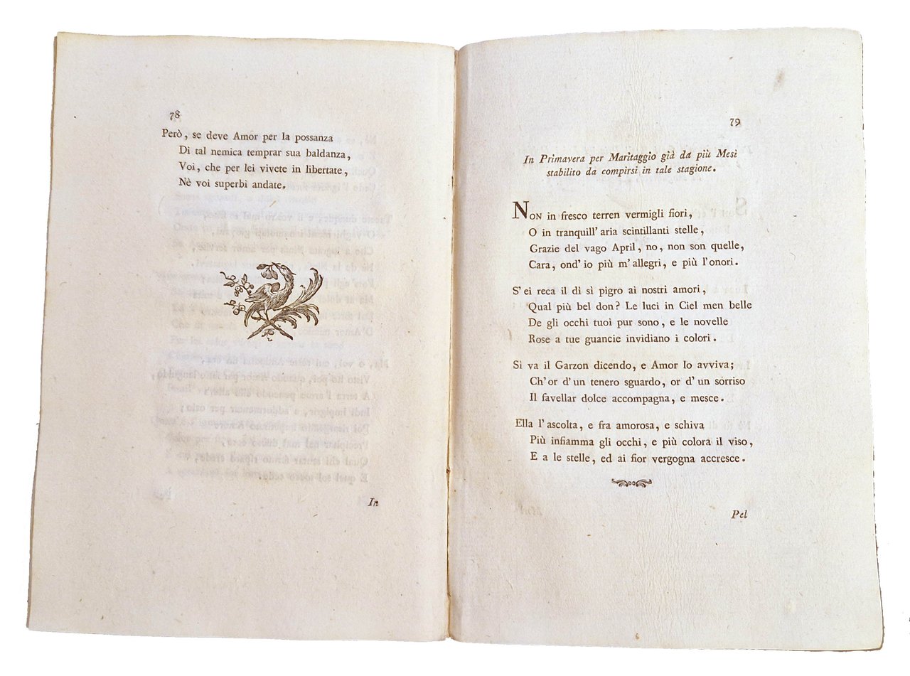in-4°, 216x146 mm, leg. originale in cartonato rivestito da carta decorata dei Remondini; pp. [8], 99, [1 b.], [2] carte di tav. ripiegate (musica); questo esemplare è nella variante B con la carta F10v bianca. Il nome dello stampatore è Giuseppe Remondini e figli. Il testo comprende: Musica del Sig.r Sen.re March.e Lodovico Bolognini. - partitura ([1] carta), 23 x 39 cm; Musica del Sig.r Conte Ercole Orsi. - partitura ([1] carta), 23 x 39 cm, Orsi, Ercole (conte; sec. XVIII). Prima edizione di questa raccolta di componimenti poetici, integrata da due partiture di musica. Rif.: IT\ICCU\VIAE\005988. OCLC, 801157765. Cond.: Tracce d'uso alla legatura (scoloriture delle carte, mancanze al dorso). Carte pulite, testo marginoso stampato su carta forte. Esemplare molto buono.