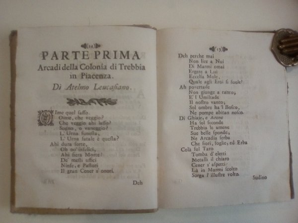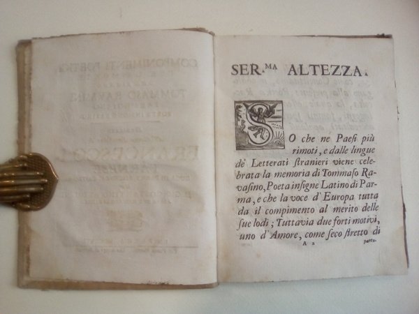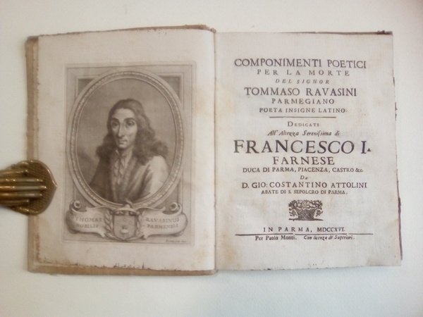 Componimenti poetici per la morte del signor Tommaso Ravasini parmegiano poeta insigne latino. Dedicati all'Altezza Serenissima di Francesco I Farnese Duca di Parma, Piacenza, Castro &c. da D. Gio: Costantino Attolini abate di S. Sepolcro di Parma.