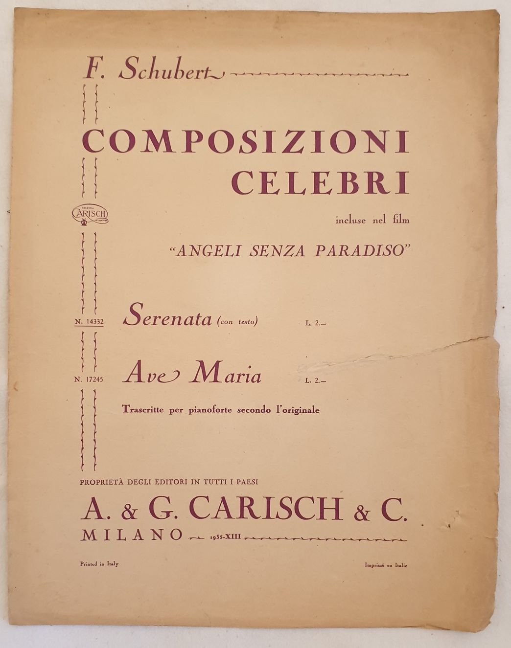 Spartito del 1935 della celebre Serenata di Franz Schubert nel film "angeli senza paradiso". Partitura per pianoforte e foglio con testo manoscritto. In discrete condizioni con rare fioriture e mende. Strappo orizzontale Formato cm. 34x27. Pp. (2).Musical score of 1935 of Serenata by Franz Schubert in the movie "angeli senza paradiso" Score for piano and handwritten text. In fair conditions with occasional foxings and usage signs. Horizontal tear. Size cm. cm. 34x27. Pp. (2).