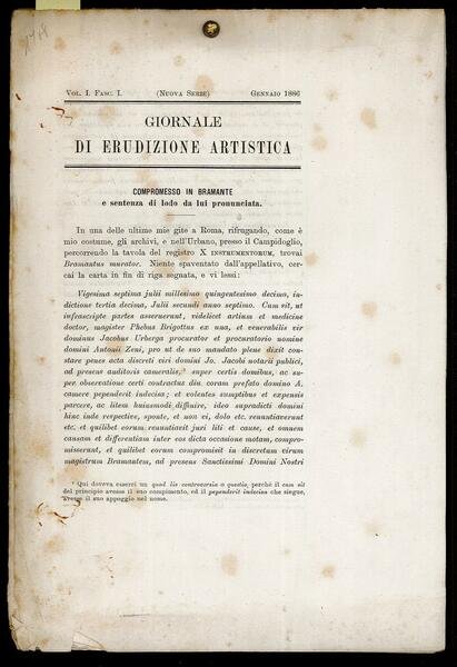 Opuscolo vintage. Estratto dal Giornale di Erudizione Artistica - Nuova Serie - Vol. I - fasc. I - gennaio 1886. Usura da scaffale. Ordinario segno del tempo.